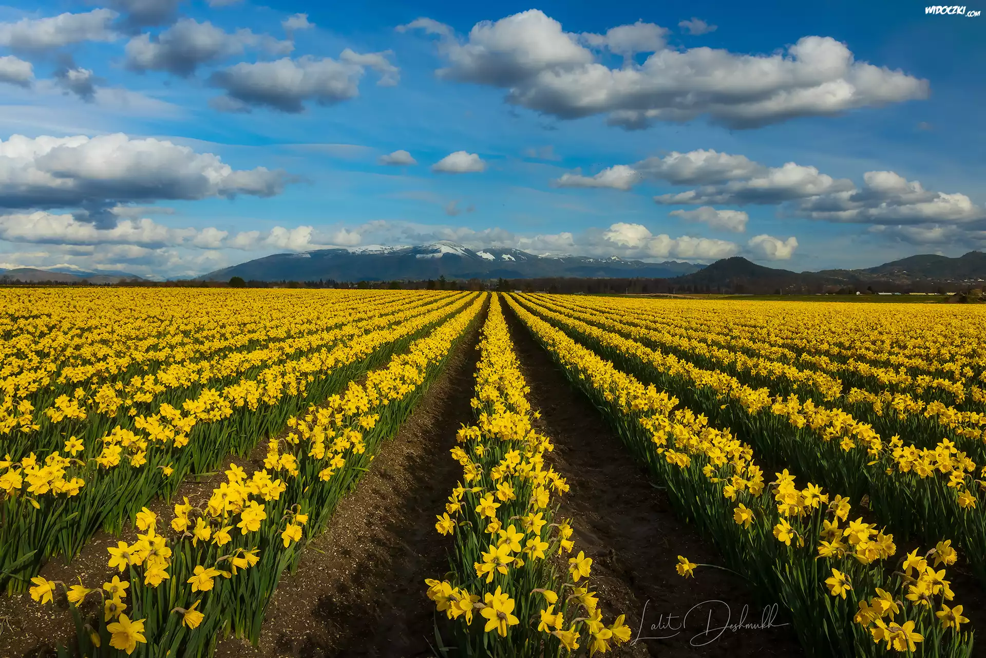 Zdjęcia, Pole, Kwiaty, Żółte, Narcyzy żonkile, Plantacja, Góry