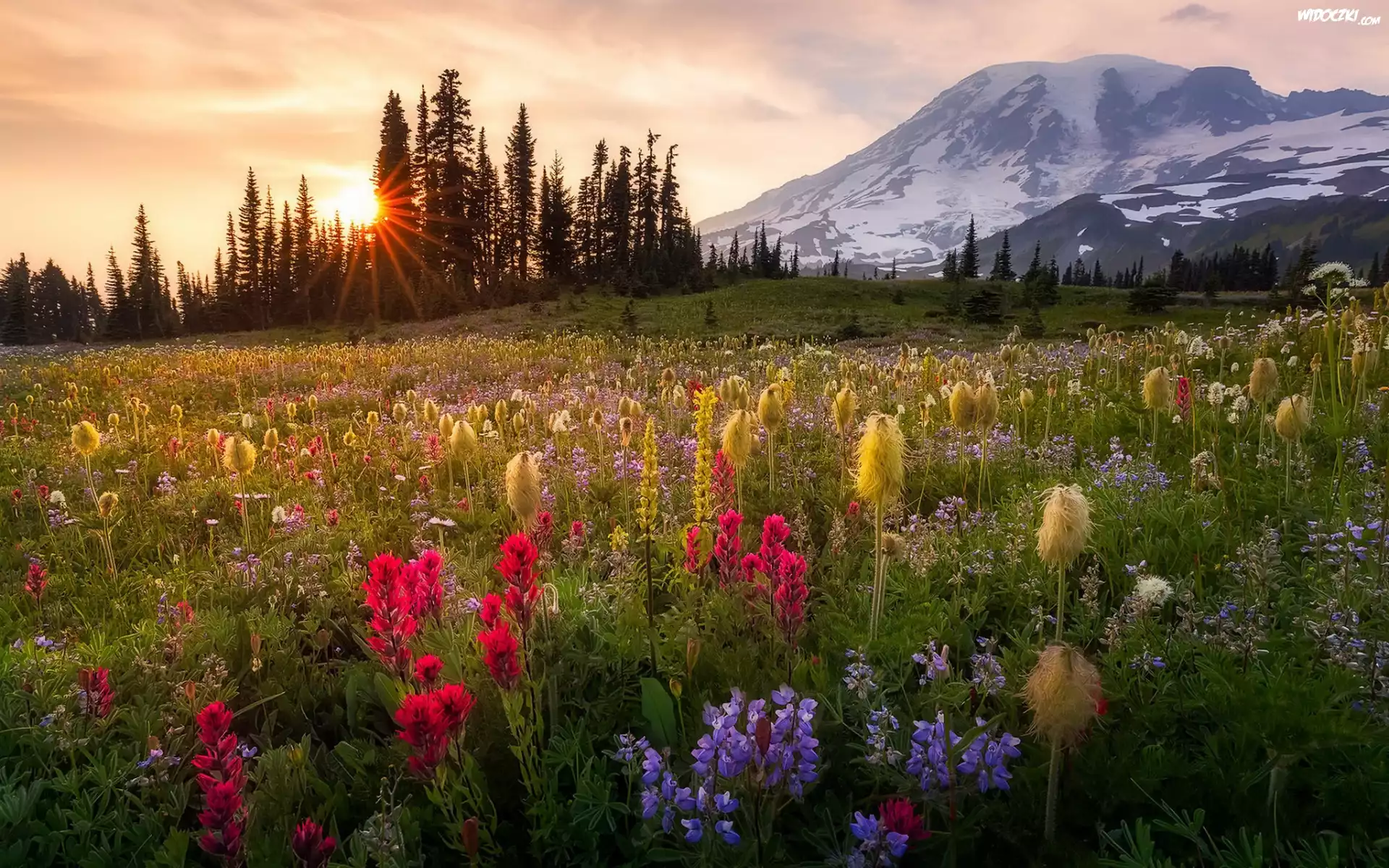 Łąka, Stratowulkan Mount Rainier, Park Narodowy Mount Rainier, Góry, Kwiaty, Alpinia purpurowa, Wschód słońca, Stan Waszyngton, Stany Zjednoczone |