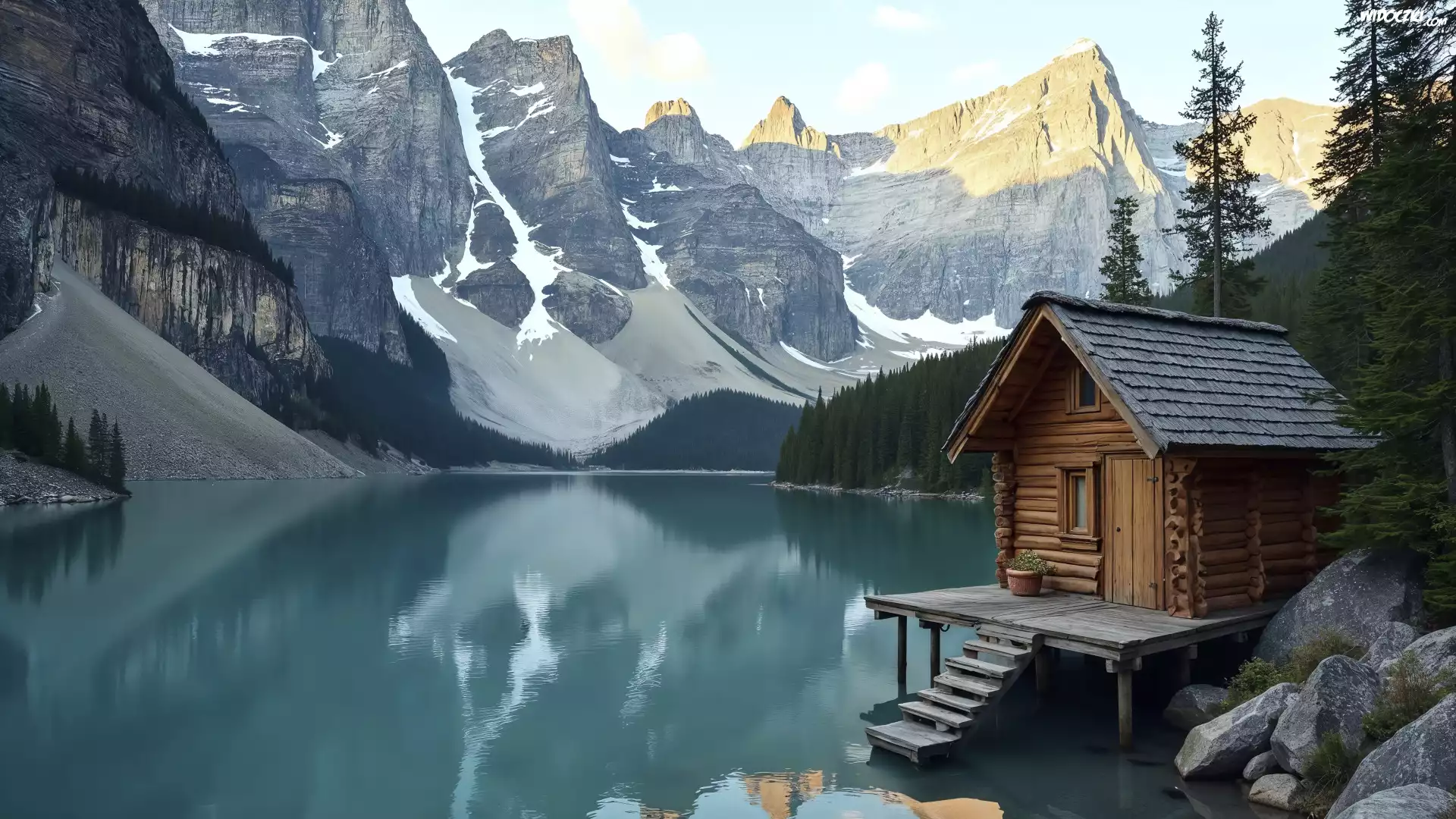 Zdjęcia, Kanada, Góry, Jezioro, Moraine Lake, Park Narodowy Banff, Drewniany, Dom, Grafika