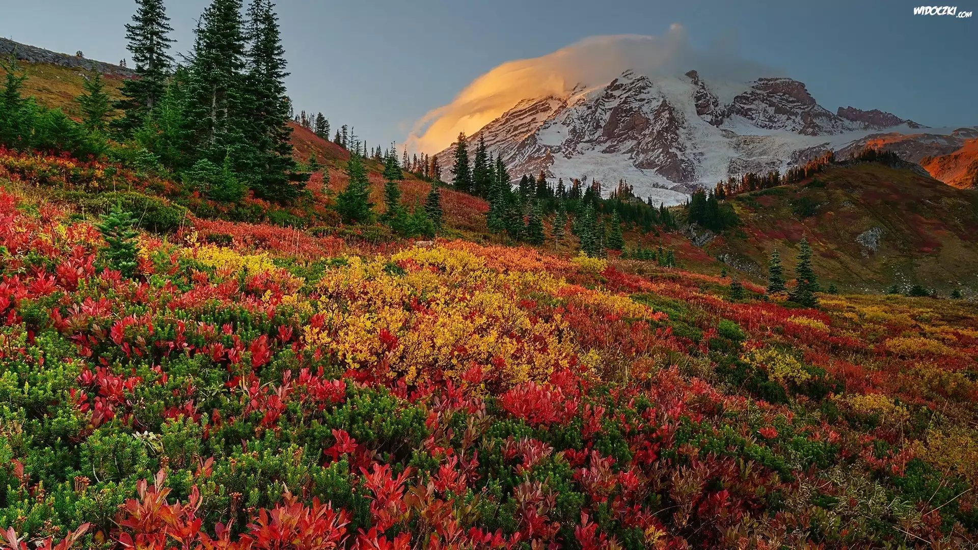 Góra, Wulkan, Mount Rainier, Drzewa, Kolorow, Roślinność, Park Narodowy Mount Rainier, Waszyngton, Stany Zjednoczone |
