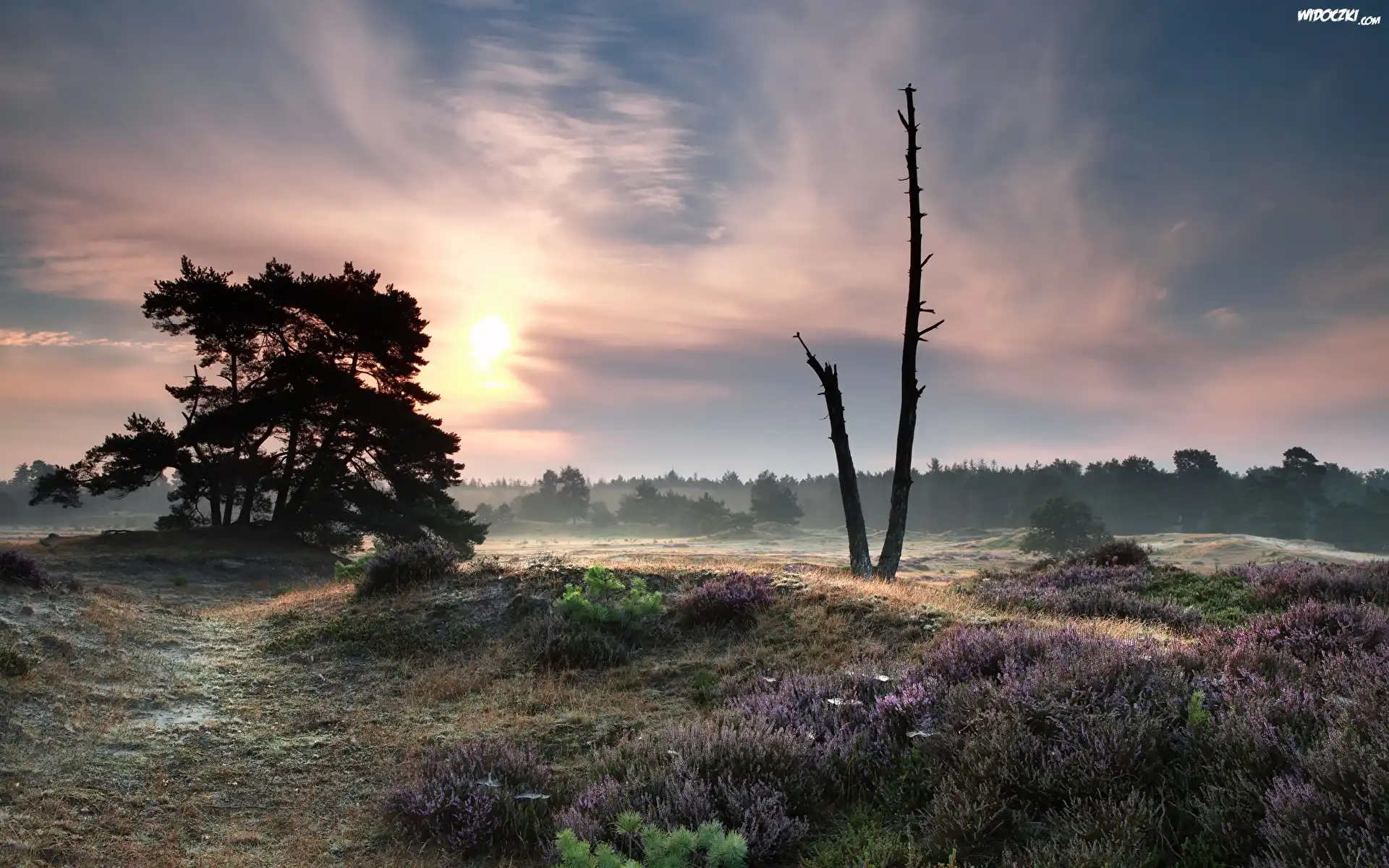 Zdjęcia, Holandia, Park Narodowy Drents-Friese Wold, Wrzosowisko, Wschód słońca, Mgła, Drzewa