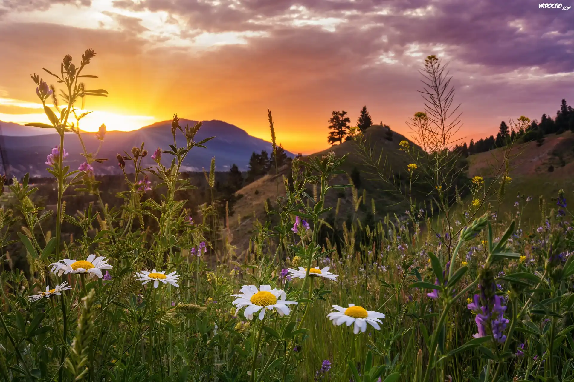 Zdjęcia, Kanada, Park Narodowy Kootenay, Góry, Łąka, Kwiaty, Polne, Rumianek, Zachód słońca