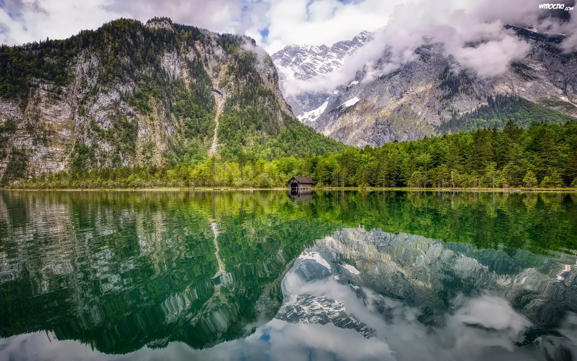 Jezioro Konigssee, Park Narodowy Berchtesgaden, Drewniana, Chata, Las, Drzewa, Góry, Bawaria, Niemcy, Odbicie |
