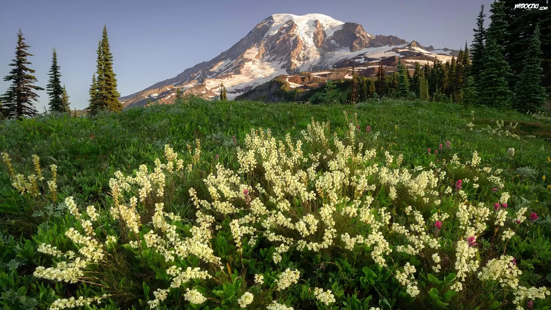 Zdjęcia, Góry, Drzewa, Łąka, Kwiaty, Park Narodowy Mount Rainier, Stan Waszyngton, Stany Zjednoczone