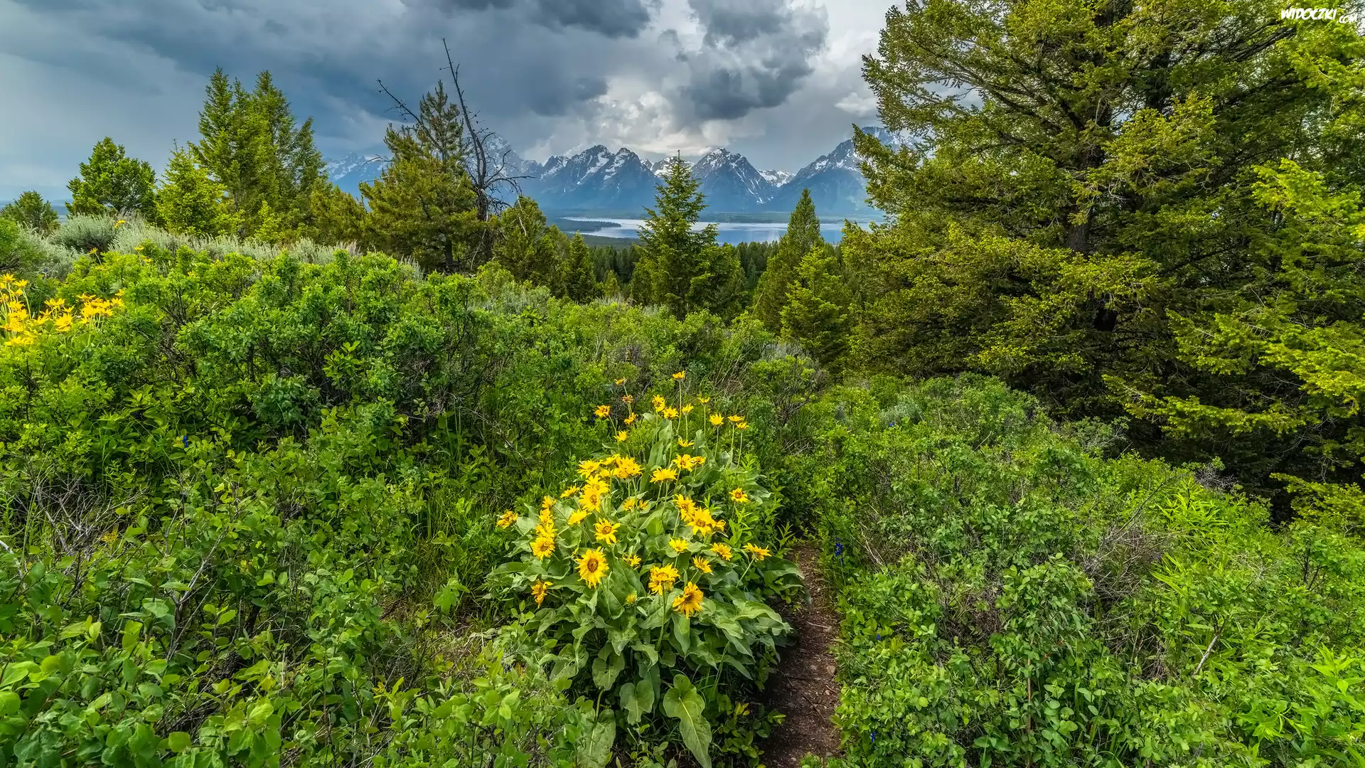 Zdjęcia, Kwiaty, Balsamorhiza, Drzewa, Góry, Chmury, Park Narodowy Grand Teton, Stany Zjednoczone