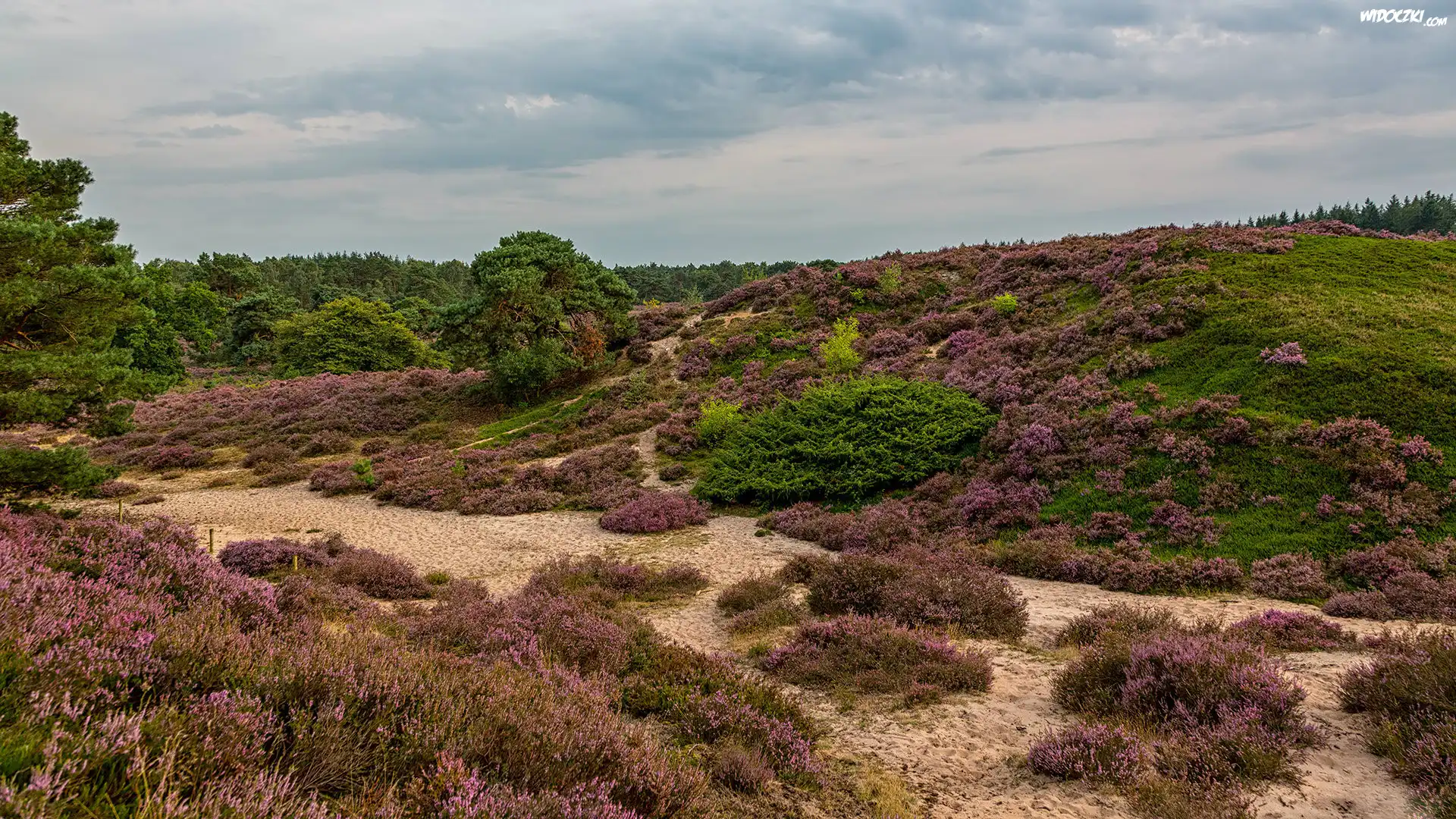 Holandia, Park Narodowy De Hoge Veluwe, Wrzosy, Trawa, Drzewa, Wzgórza, Wrzosowisko