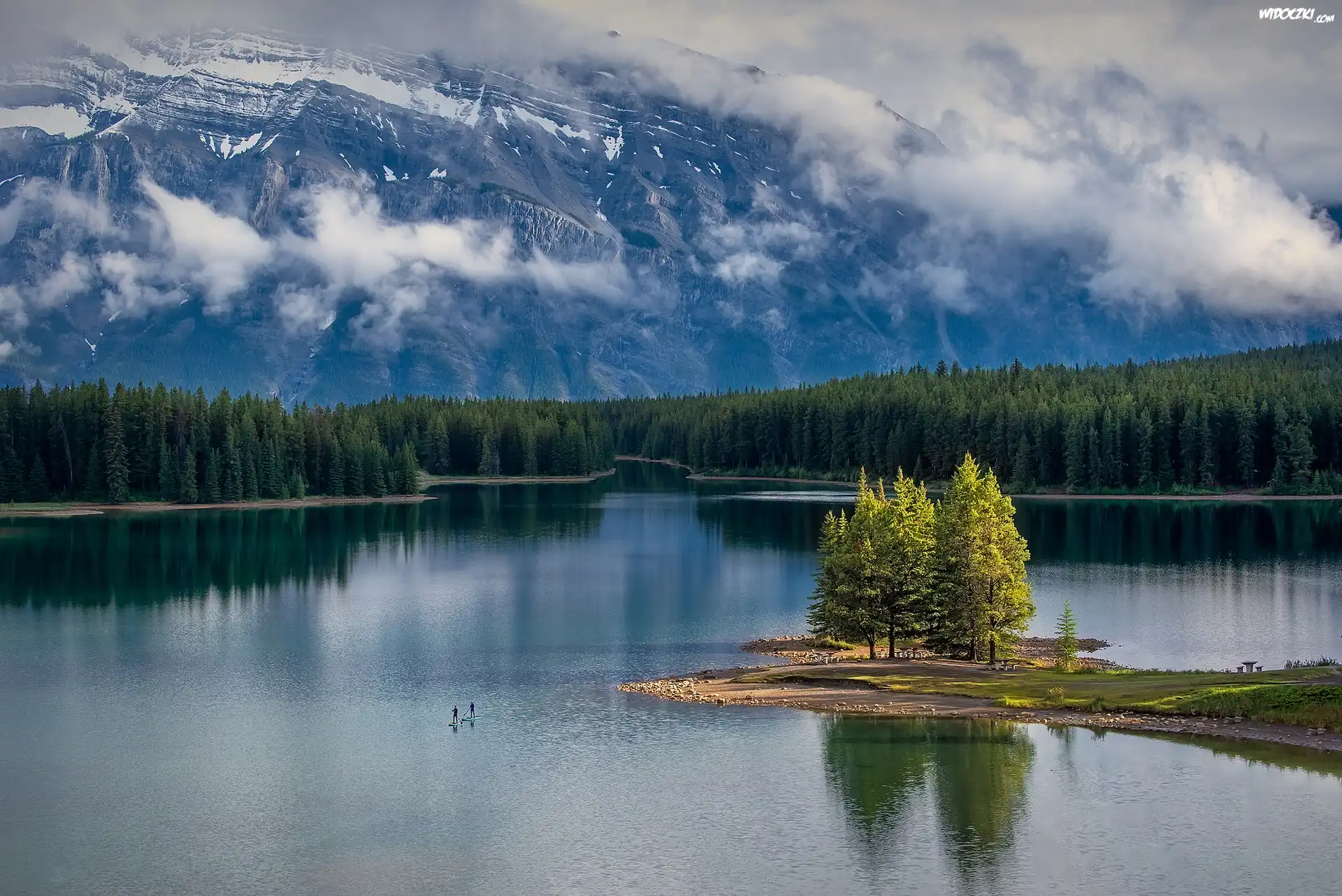 Zdjęcia, Jezioro, Two Jack London, Park Narodowy Banff, Wysepka, Drzewa, Góry, Mgła, Kanada