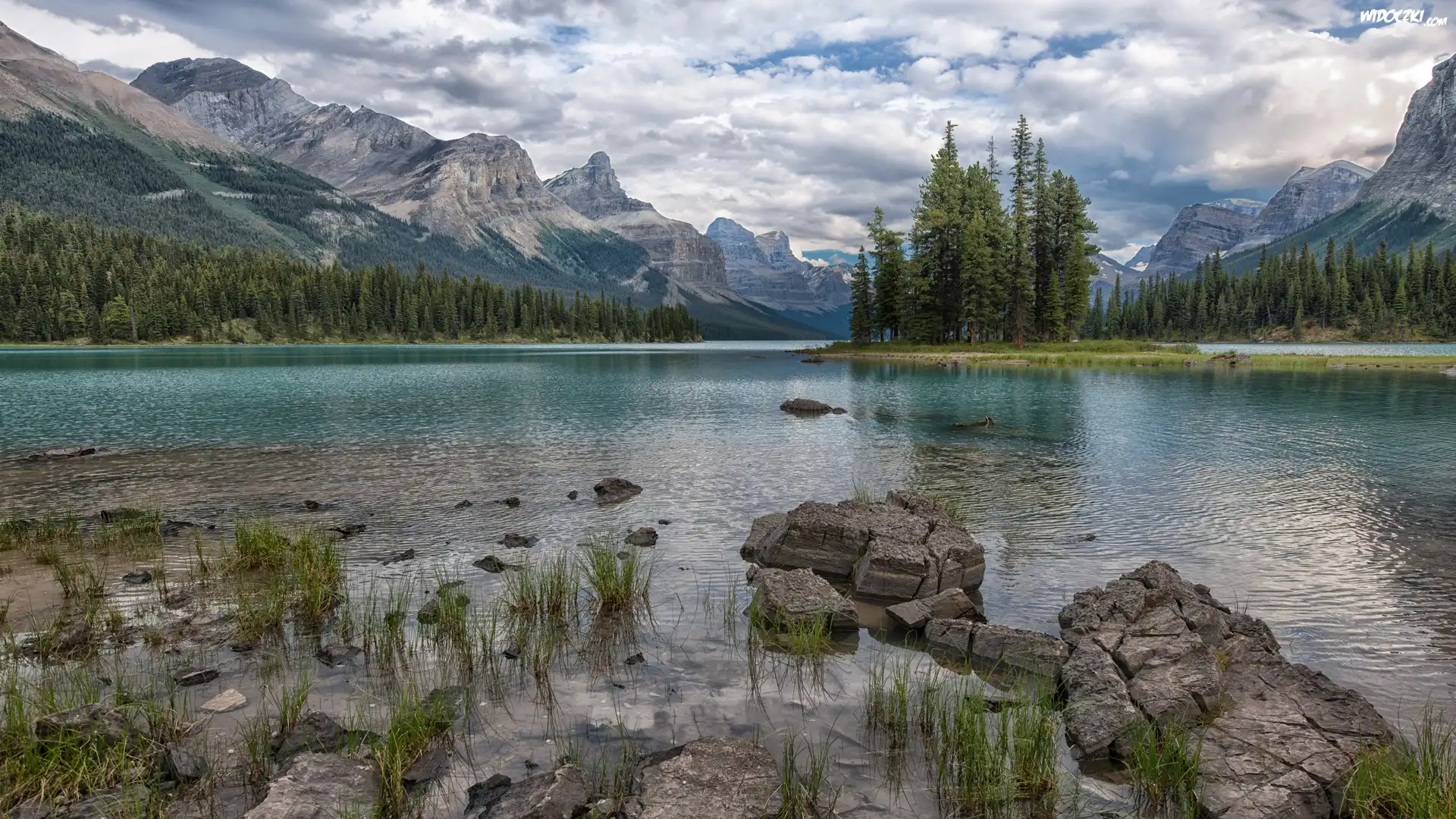 Zdjęcia, Kanada, Park Narodowy Jasper, Jezioro Maligne, Wyspa Ducha, Góry, Chmury, Drzewa