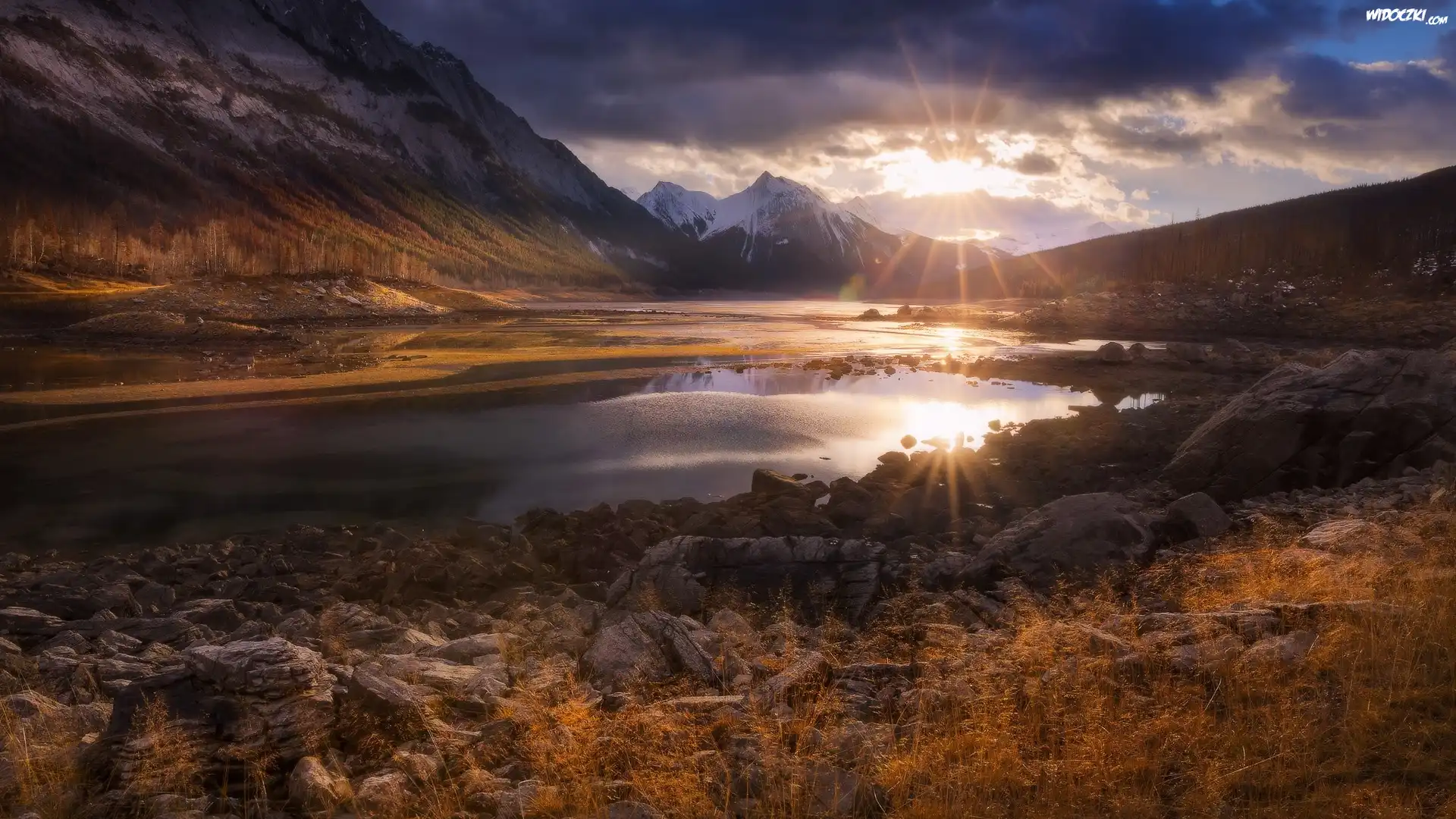 Zdjęcia, Kanada, Park Narodowy Jasper, Jezioro Medicine Lake, Góry, Wschód słońca Kanada