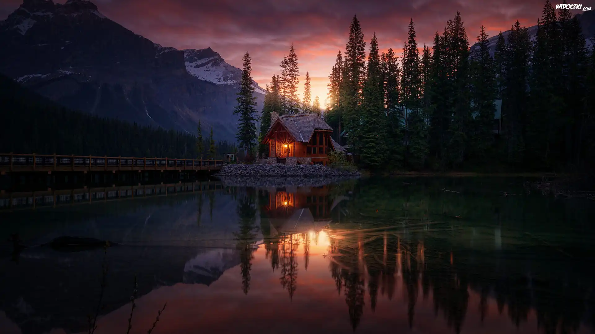 Zdjęcia, Kanada, Park Narodowy Yoho, Jezioro Emerald Lake, Góry, Drzewa, Dom, Most