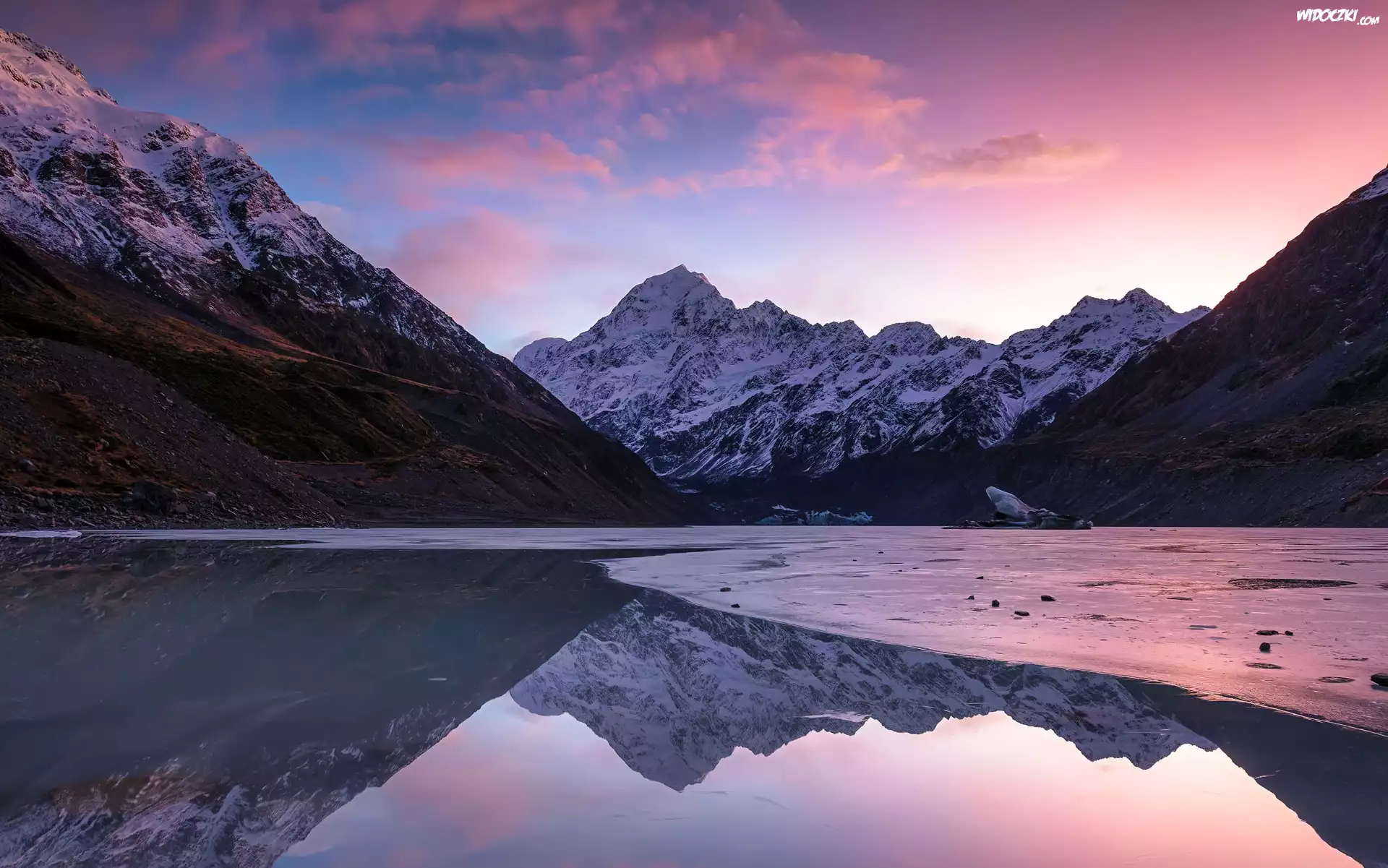 Zdjęcia, Nowa Zelandia, Park Narodowy Góry Cooka, Dolina Hooker, Góry, Jezioro, Hooker Lake, Chmury