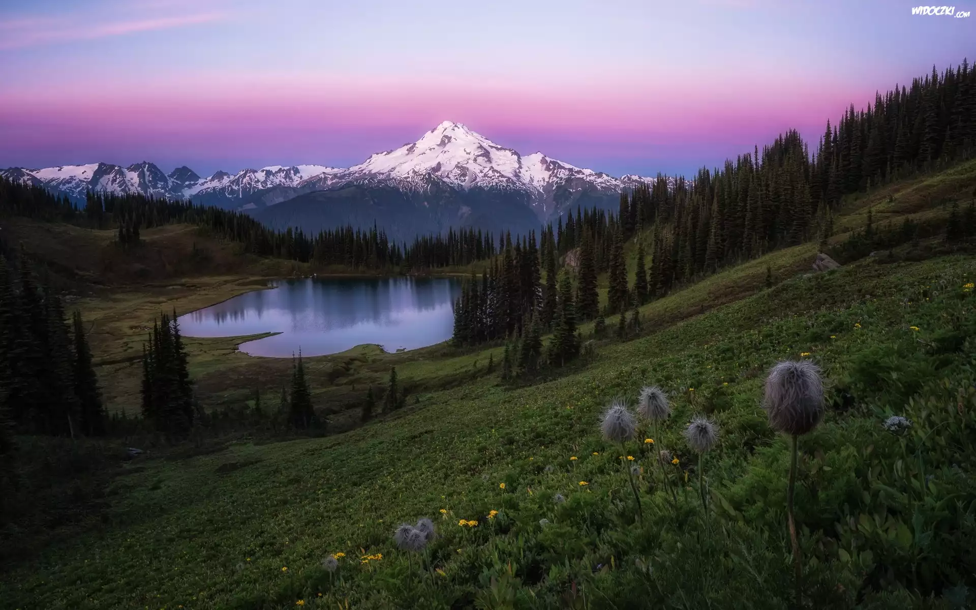 Stany Zjednoczone, Park Narodowy Mount Rainier, Góry, Mount Rainier, Jezioro, Tipsoo Lake, Drzewa
