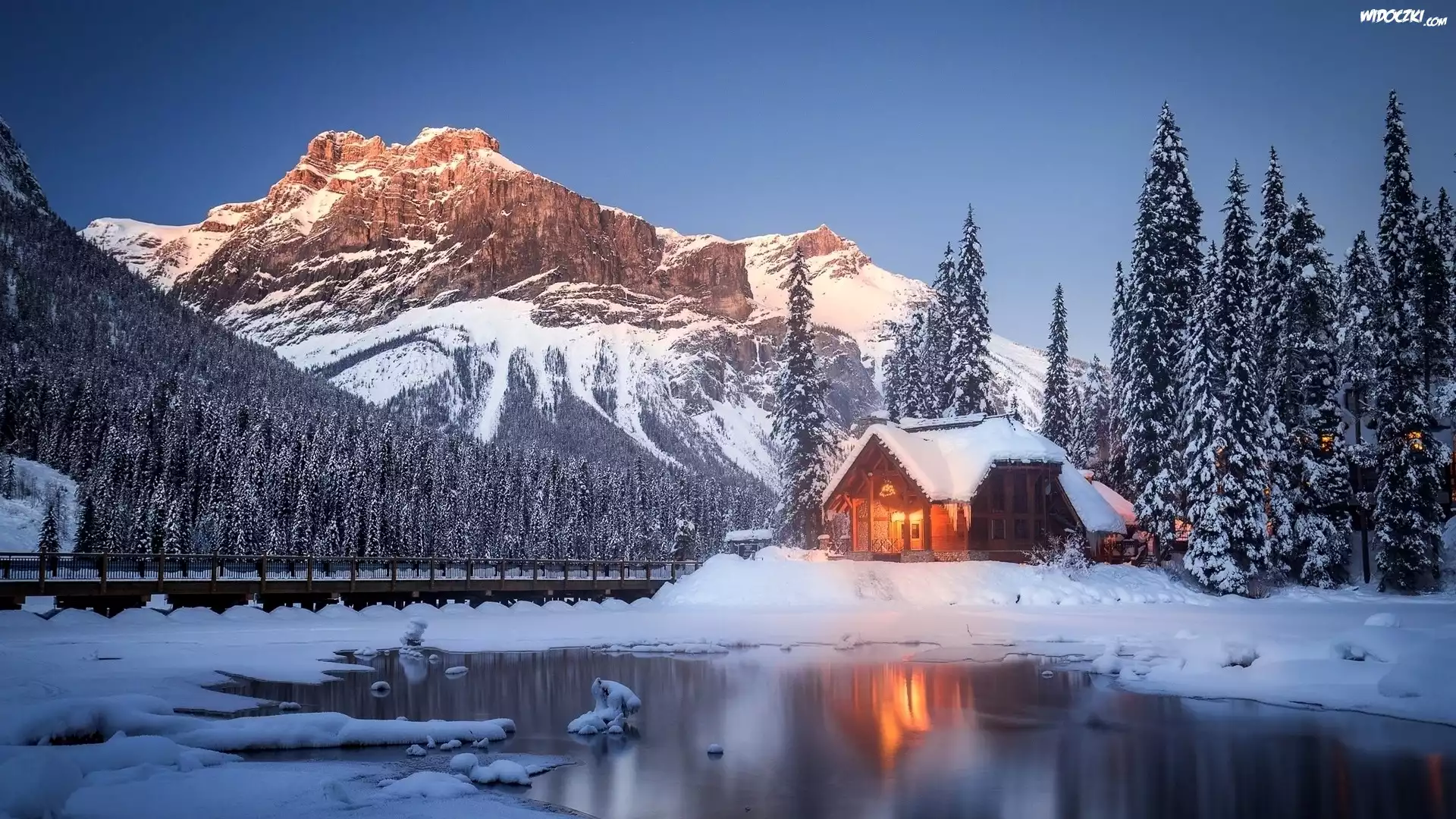 Zdjęcia, Kanada, Kolumbia Brytyjska, Park Narodowy Yoho, Jezioro Emerald Lake, Dom, Most, Góry, Drzewa, Zima