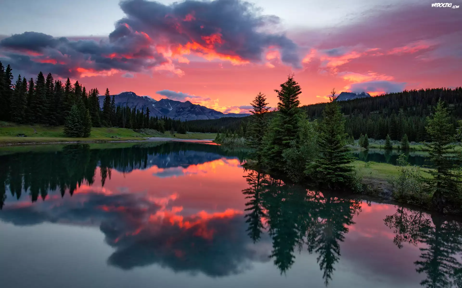 Kanada, Alberta, Park Narodowy Banff, Jezioro, Las, Drzewa, Góry, Niebo, Zachód słońca, Chmury