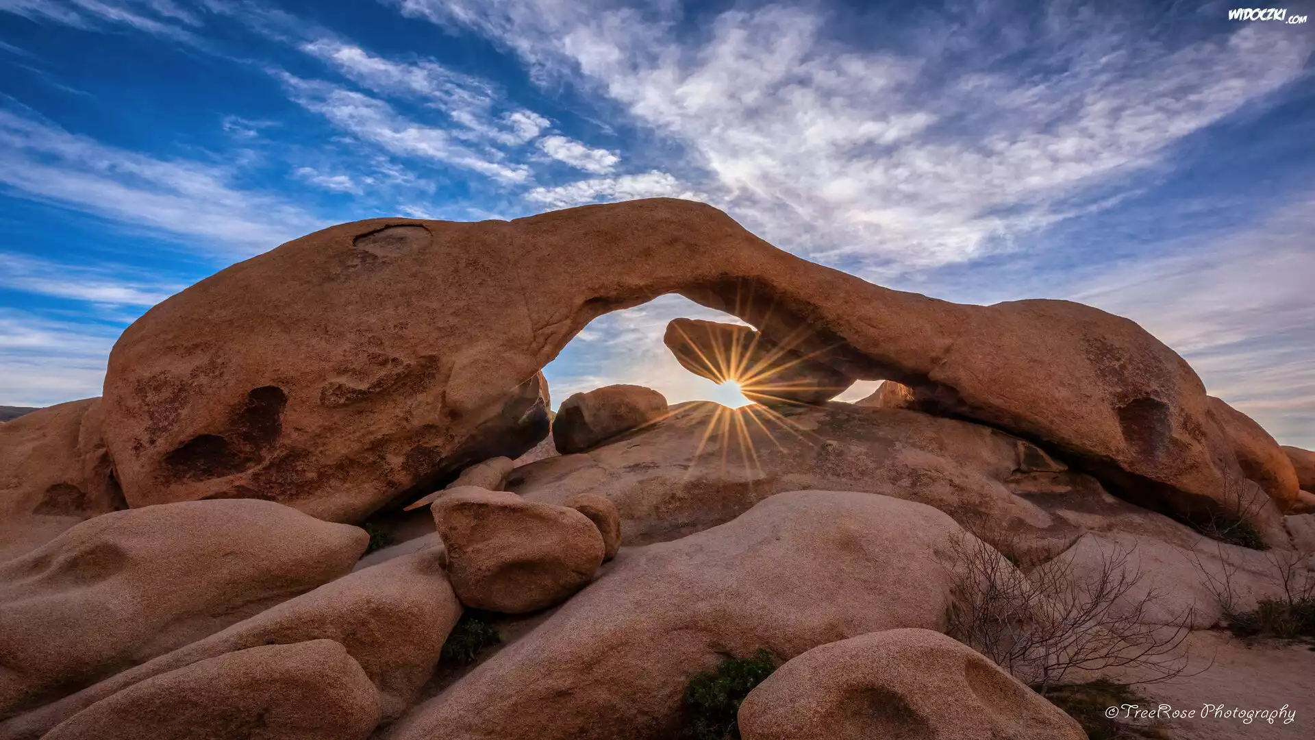 Skały, Formacja Arch Rock, Niebo, Promienie słońca, Park Narodowy Joshua Tree, Kalifornia, Stany Zjednoczone |