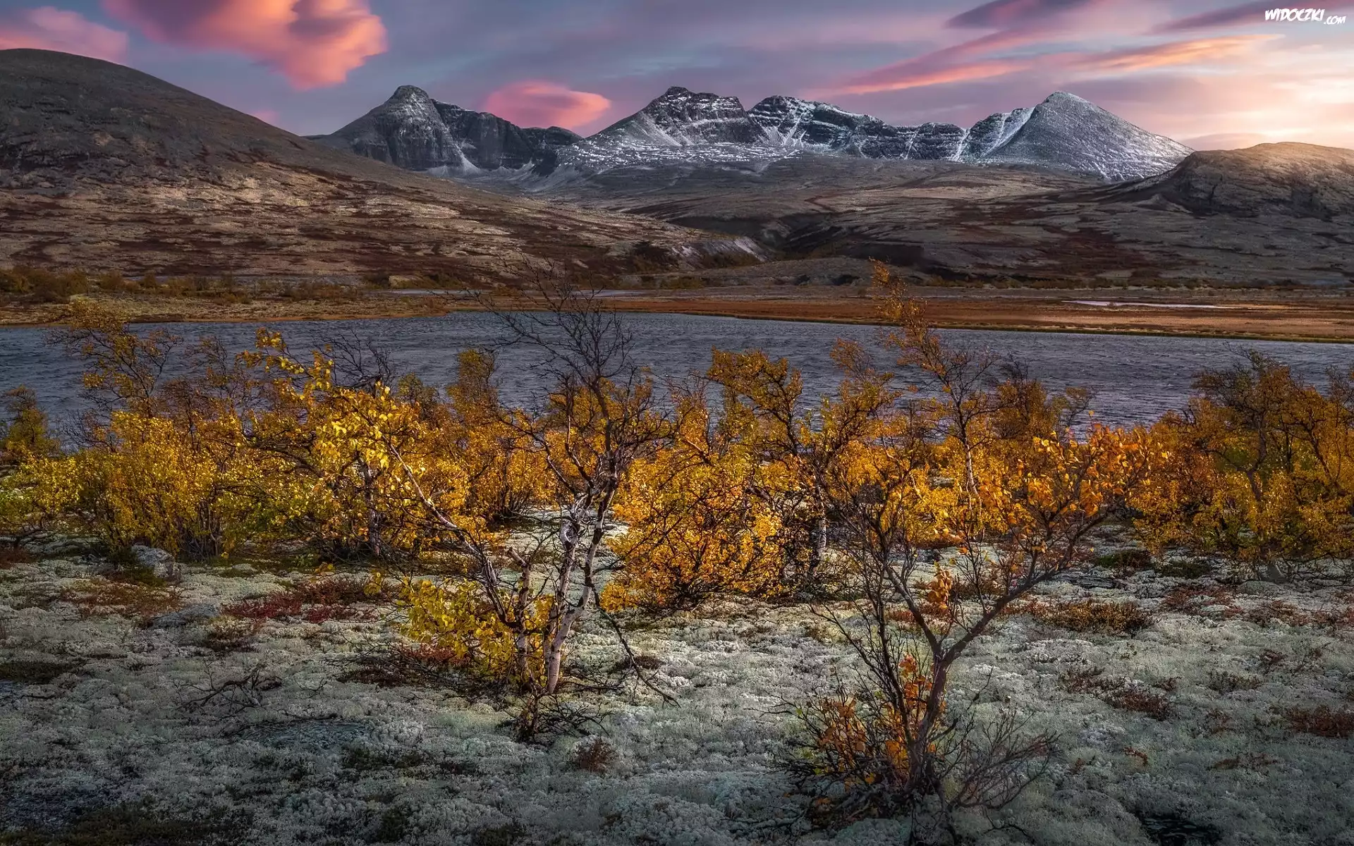 Norwegia, Okręg Oppland, Park Narodowy Rondane, Góry Rondane, Masyw Rondane, Jezioro, Roślinność, Krzewy, Jesień |