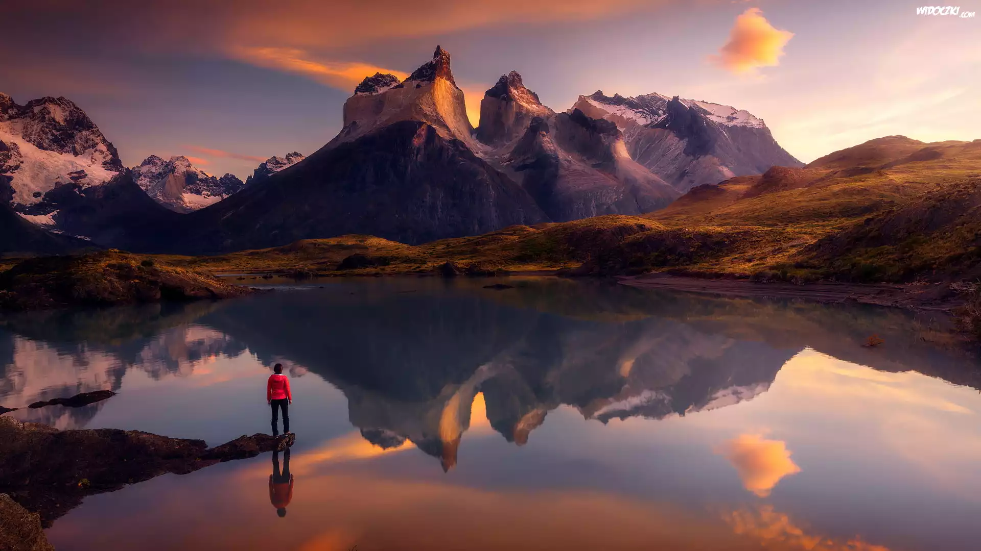 Park Narodowy Torres del Paine, Jezioro Pehoe, Góry, Cordillera del Paine, Masyw, Torres del Paine, Człowiek, Wschód słońca, Patagonia, Chile |