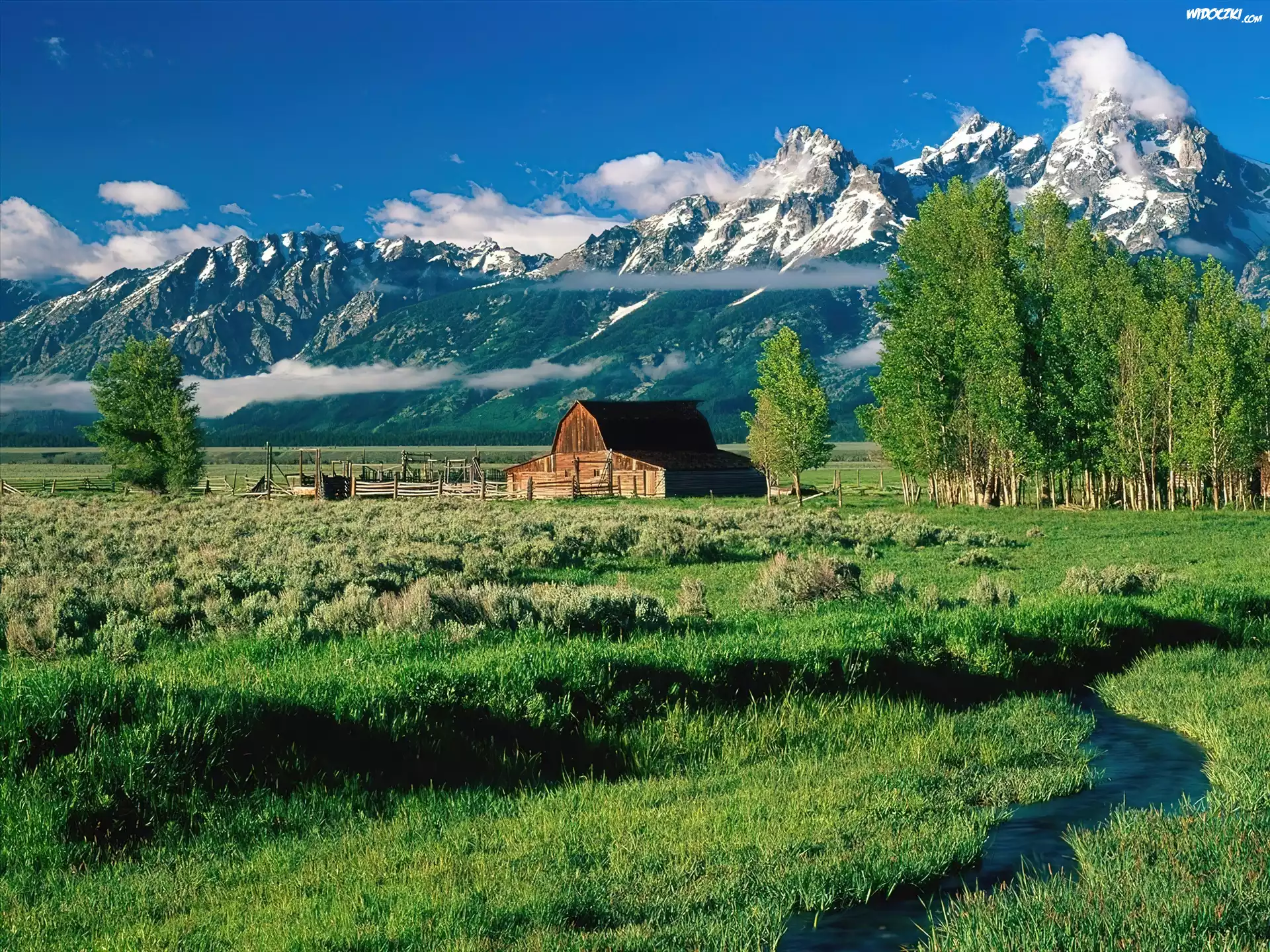 Stany Zjednoczone, Stan Wyoming, Park Narodowy Grand Teton, Góry Teton Range, Drewniany, Budynek, Drzewa, Strumyk |