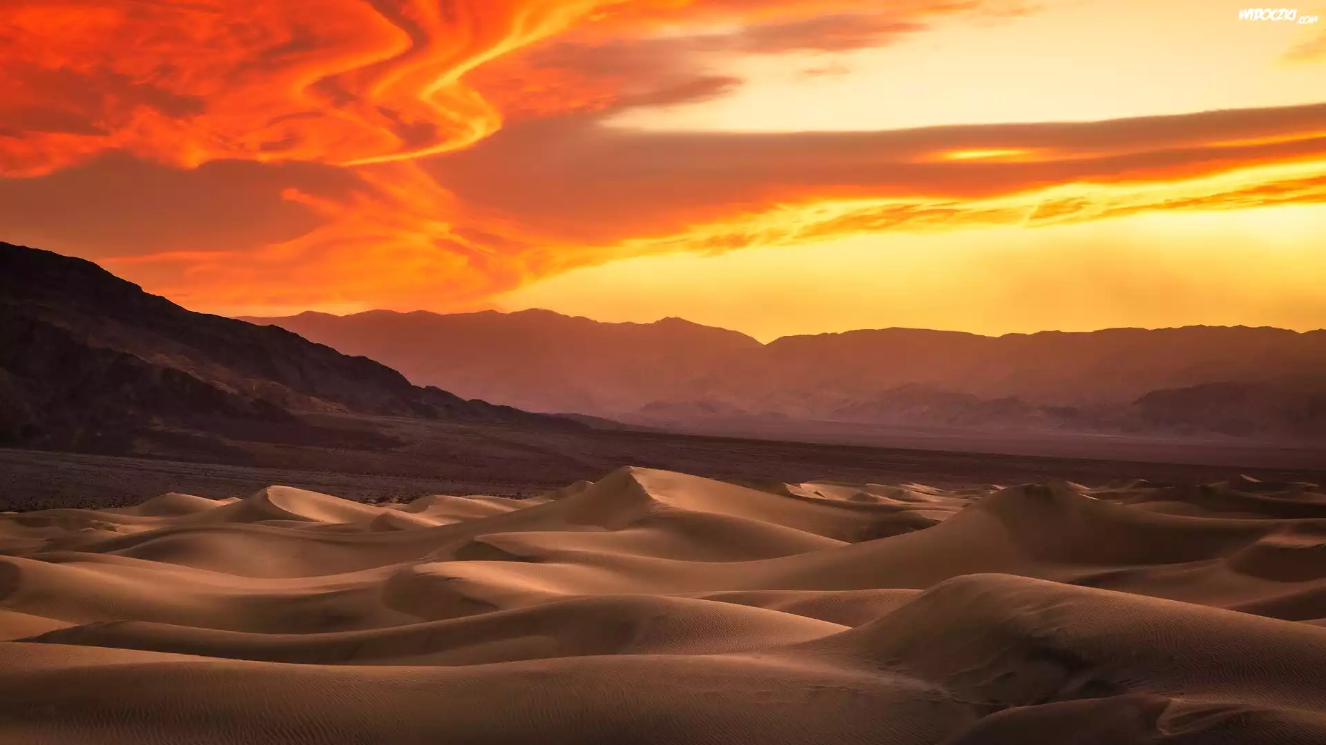 Chmury, Zachód słońca, Niebo, Piasek, Wydmy, Góry, Park Narodowy Death Valley, Kalifornia, Stany Zjednoczone |