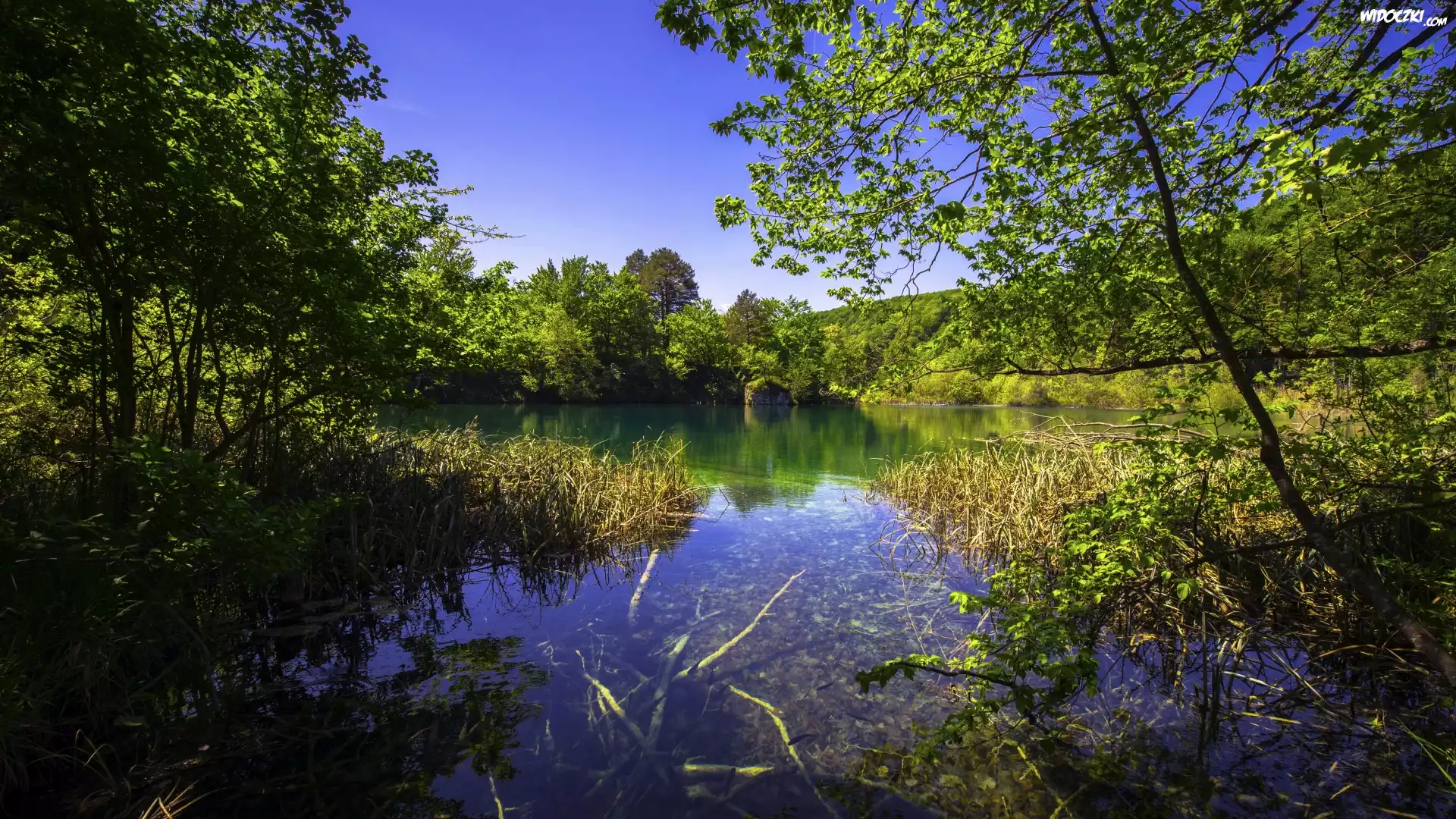 Zdjęcia, Chorwacja, Park Narodowy Jezior Plitwickich, Jezioro, Zieleń, Trawa, Drzewa, Krzewy, Niebo