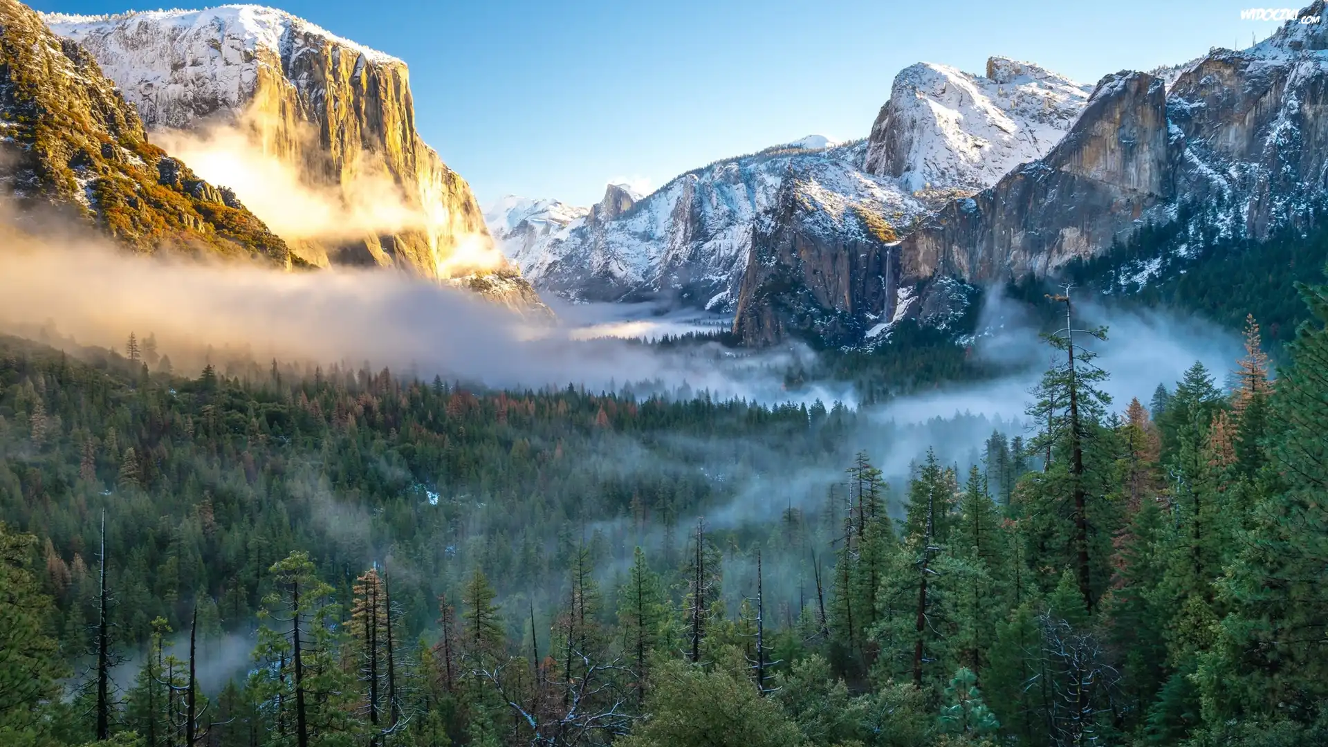 Zdjęcia, Stany Zjednoczone, Stan Kalifornia, Park Narodowy Yosemite, Góry Sierra Nevada, Mgła, Chmury