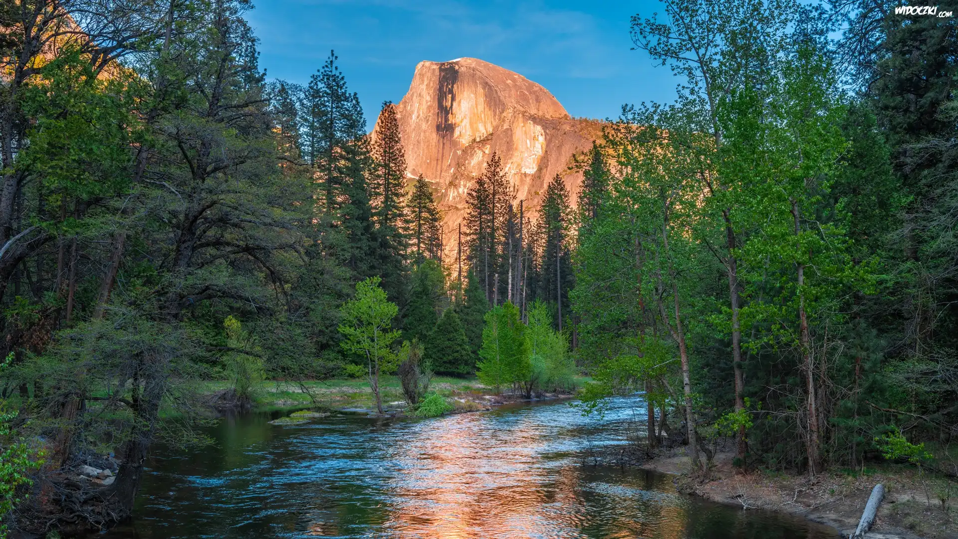 Stany Zjednocznone, Kalifornia, Park Narodowy Yosemite, Góry, Szczyt Half Dome, Rzeka, Merced River, Drzewa |