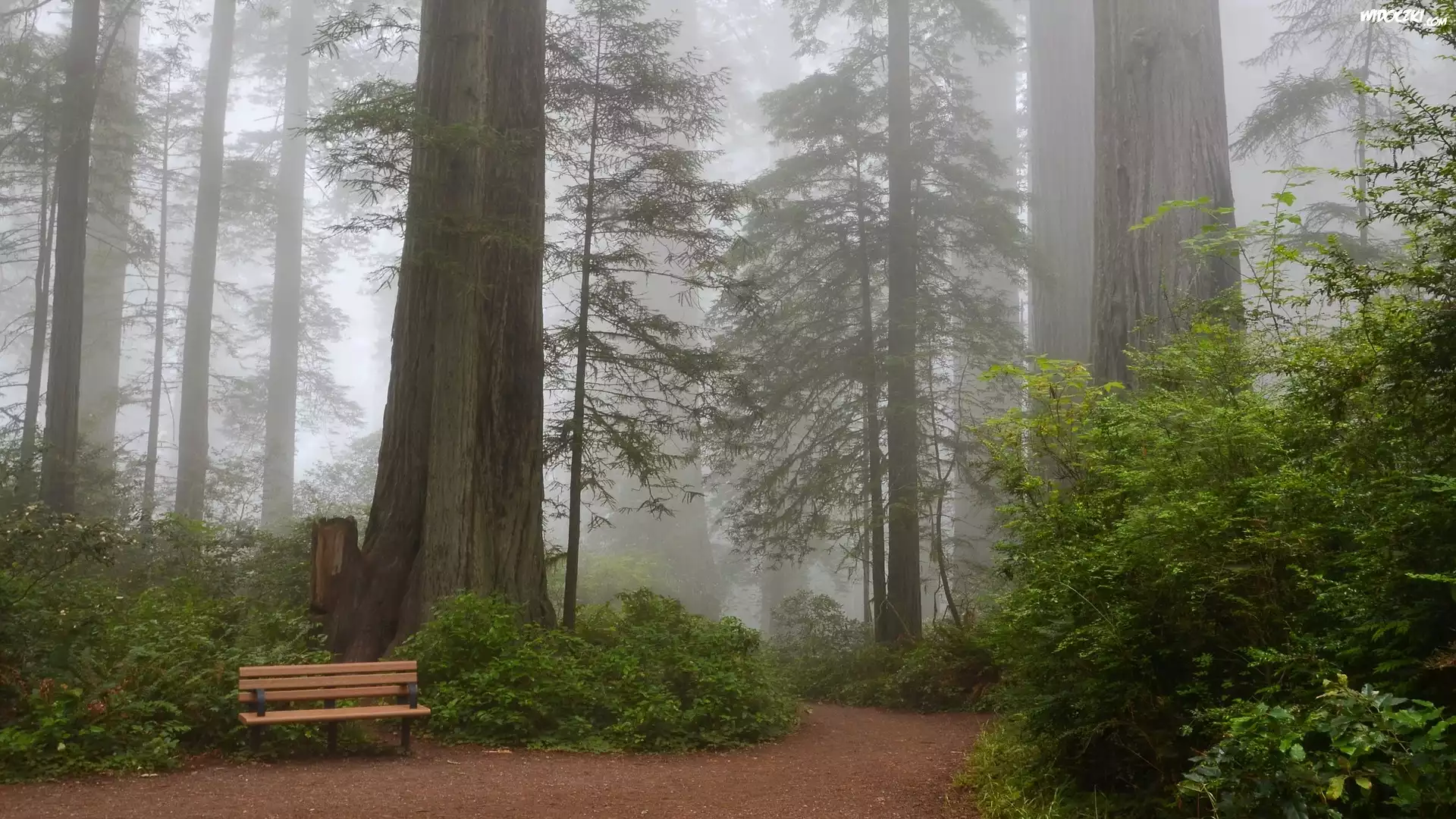 Zdjęcia, Stany Zjednoczone, Stan Kalifornia, Park Narodowy Redwood, Mgła, Droga, Ławka, Drzewa, Sekwoje