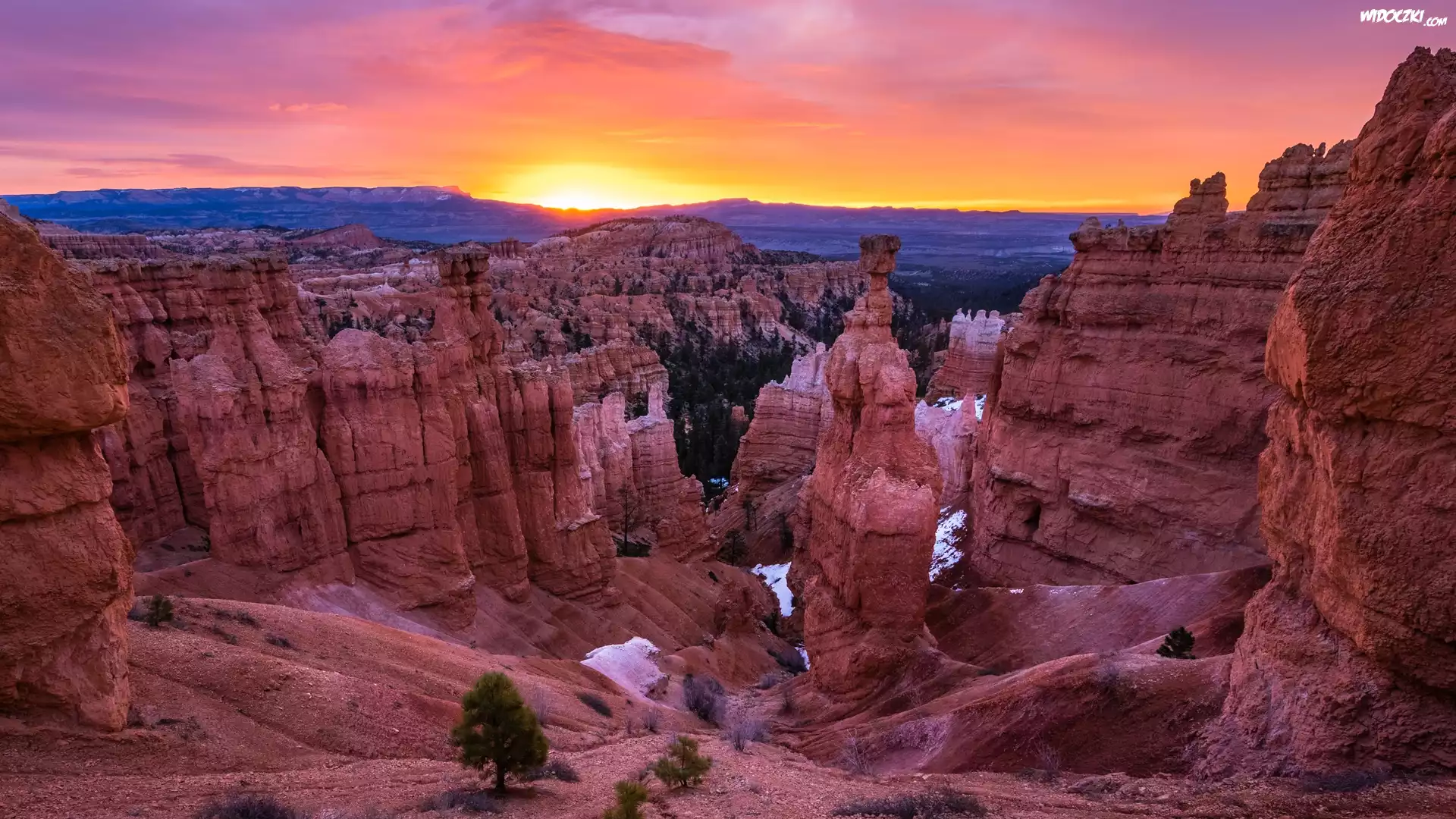 Zdjęcia, Stany Zjednoczone, Stan Utah, Park Narodowy Bryce Canyon, Skały, Roślinność, Wschód słońca