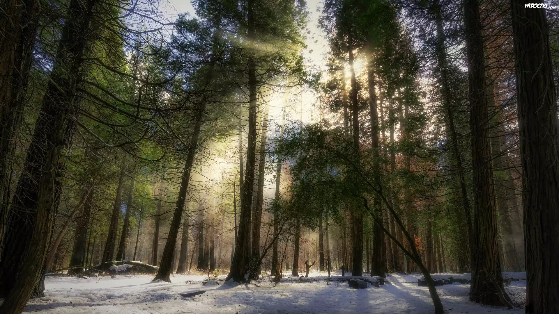 Zdjęcia, Stany Zjednoczone, Stan Kalifornia, Park Narodowy Yosemite, Las, Drzewa, Śnieg, Promienie słońca