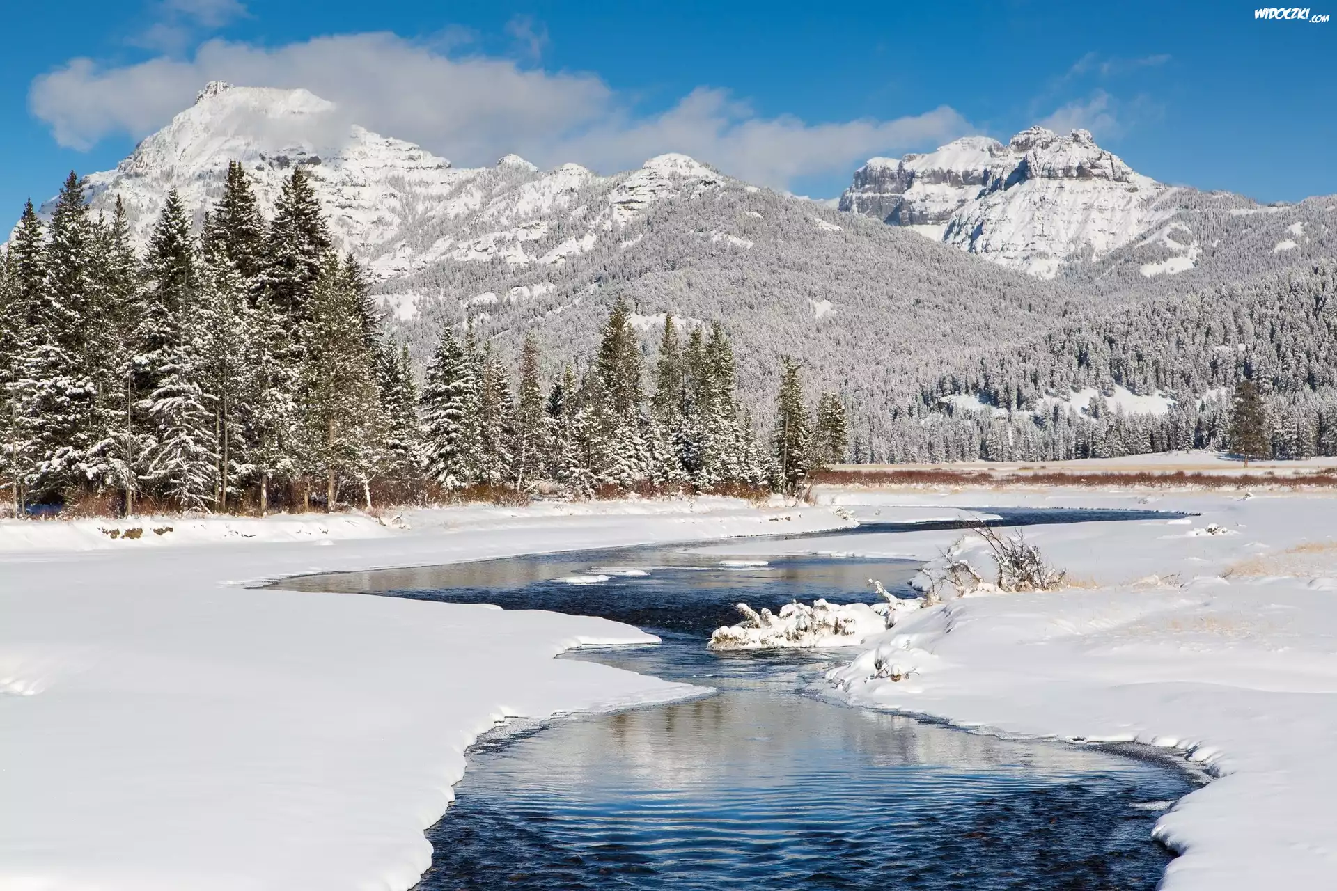 Stany Zjednoczone, Stan Wyoming, Narodowy Park Yellowstone, Rzeka Soda Butte Creek, Zima, Góry, Drzewa |