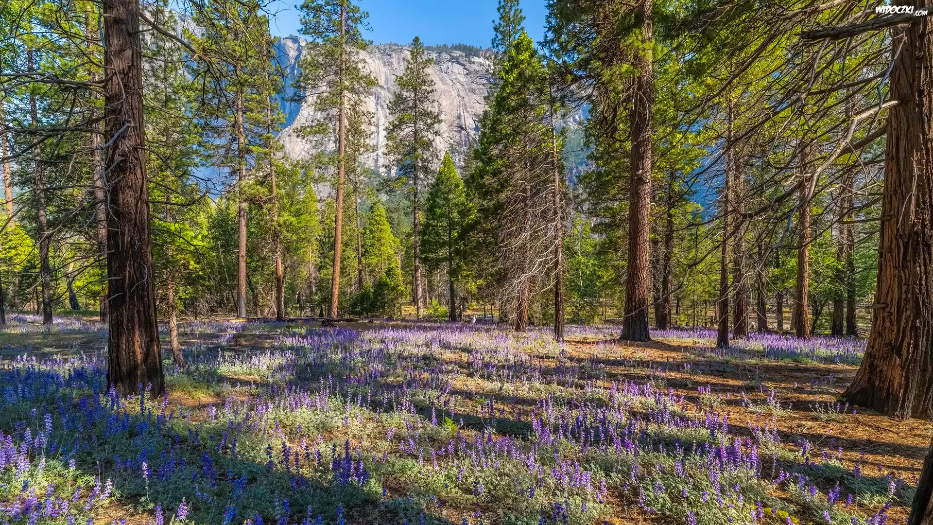 Góry, Las, Drzewa, Kwiaty, Łubin, Park Narodowy Yosemite, Kalifornia, Stany Zjednoczone