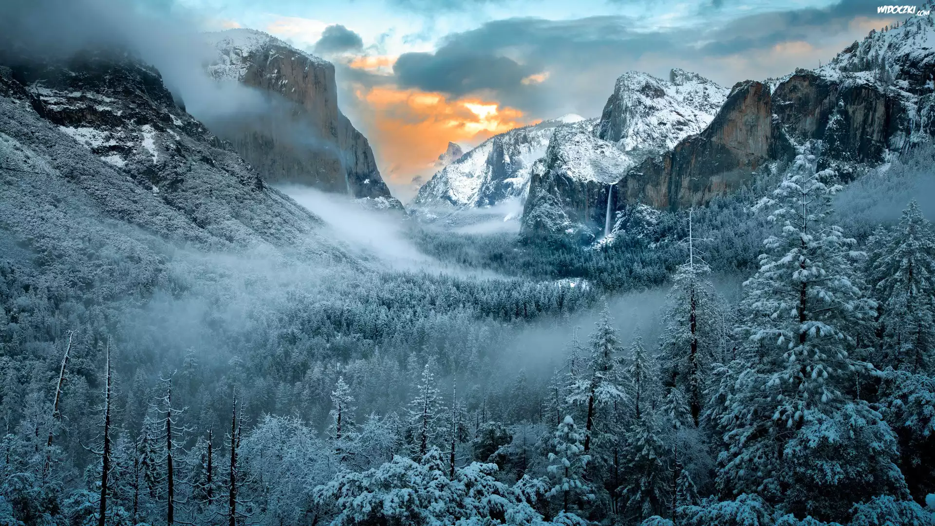 Zdjęcia, Zima, Mgła, Śnieg, Drzewa, Góry, Park Narodowy Yosemite, Kalifornia, Stany Zjednoczone