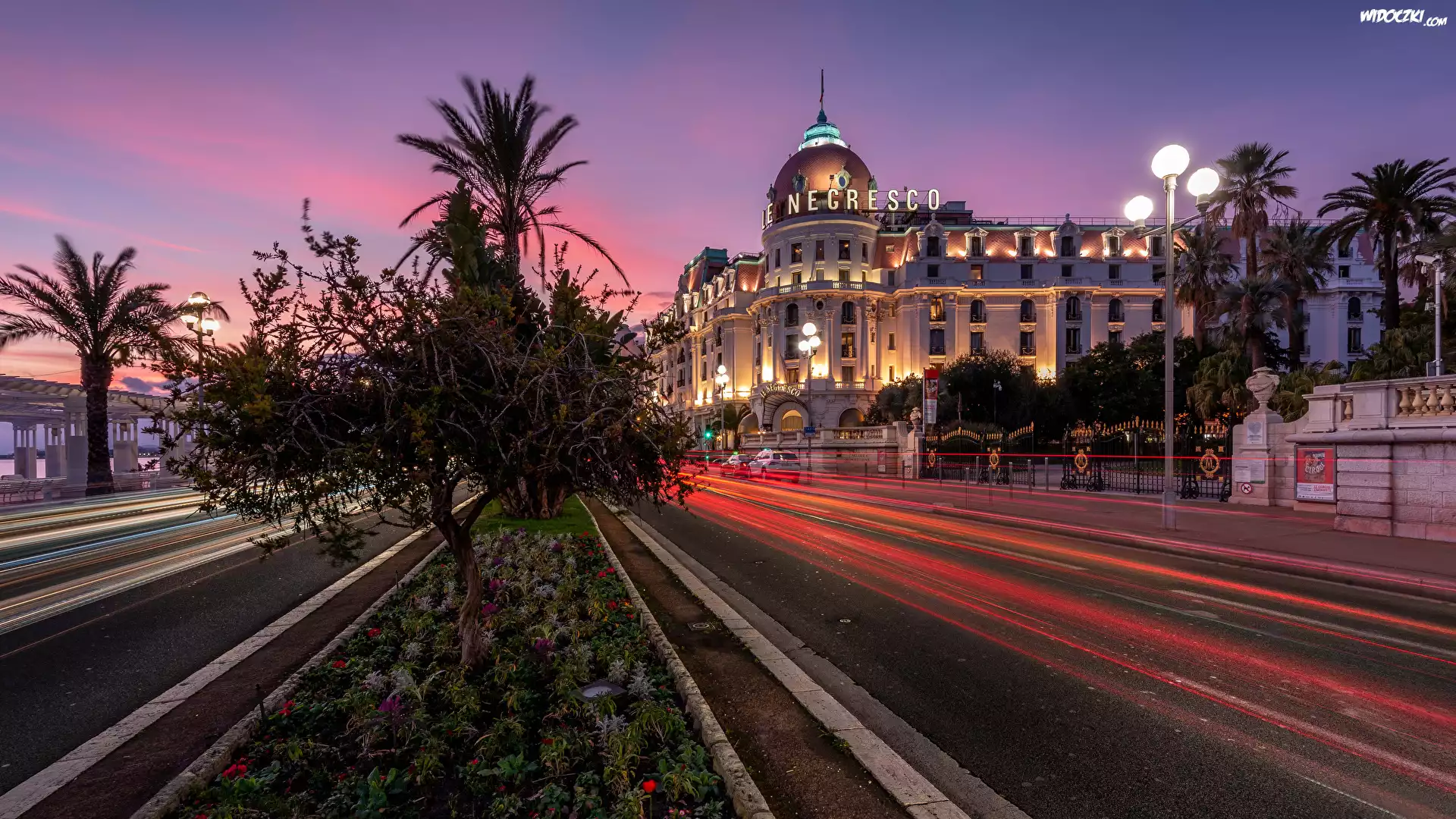 Francja, Nicea, Noc, Ulica, Drzewa, Domy, Hotel Negresco