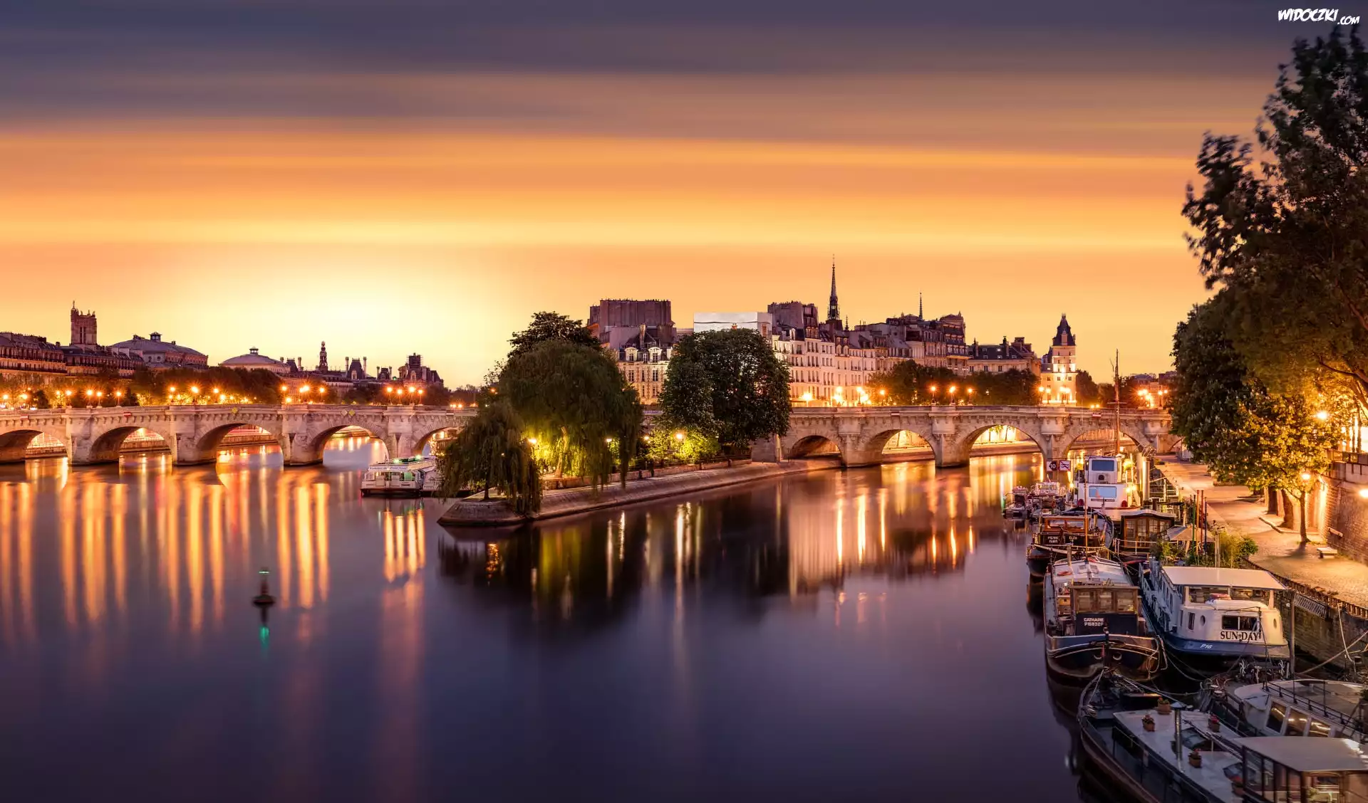 Zdjęcia, Francja, Paryż, Rzeka Sekwana, Most Pont Neuf, Domy, Łodzie, Drzewa, Światła