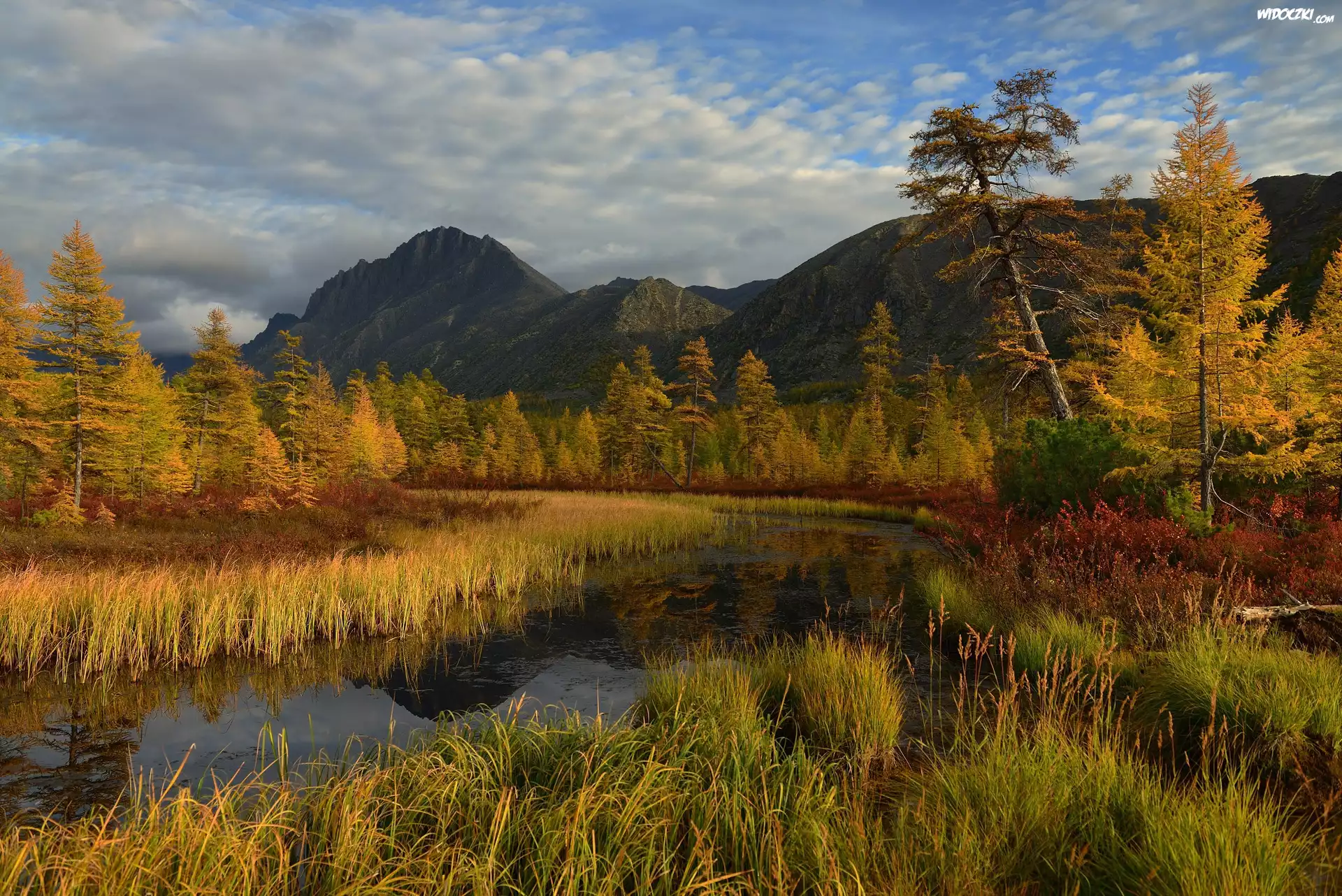 Góry Kołymskie, Masyw Angachak, Jezioro Nevidimka, Jesień, Drzewa, Kołyma, Obwód magadański, Rosja |