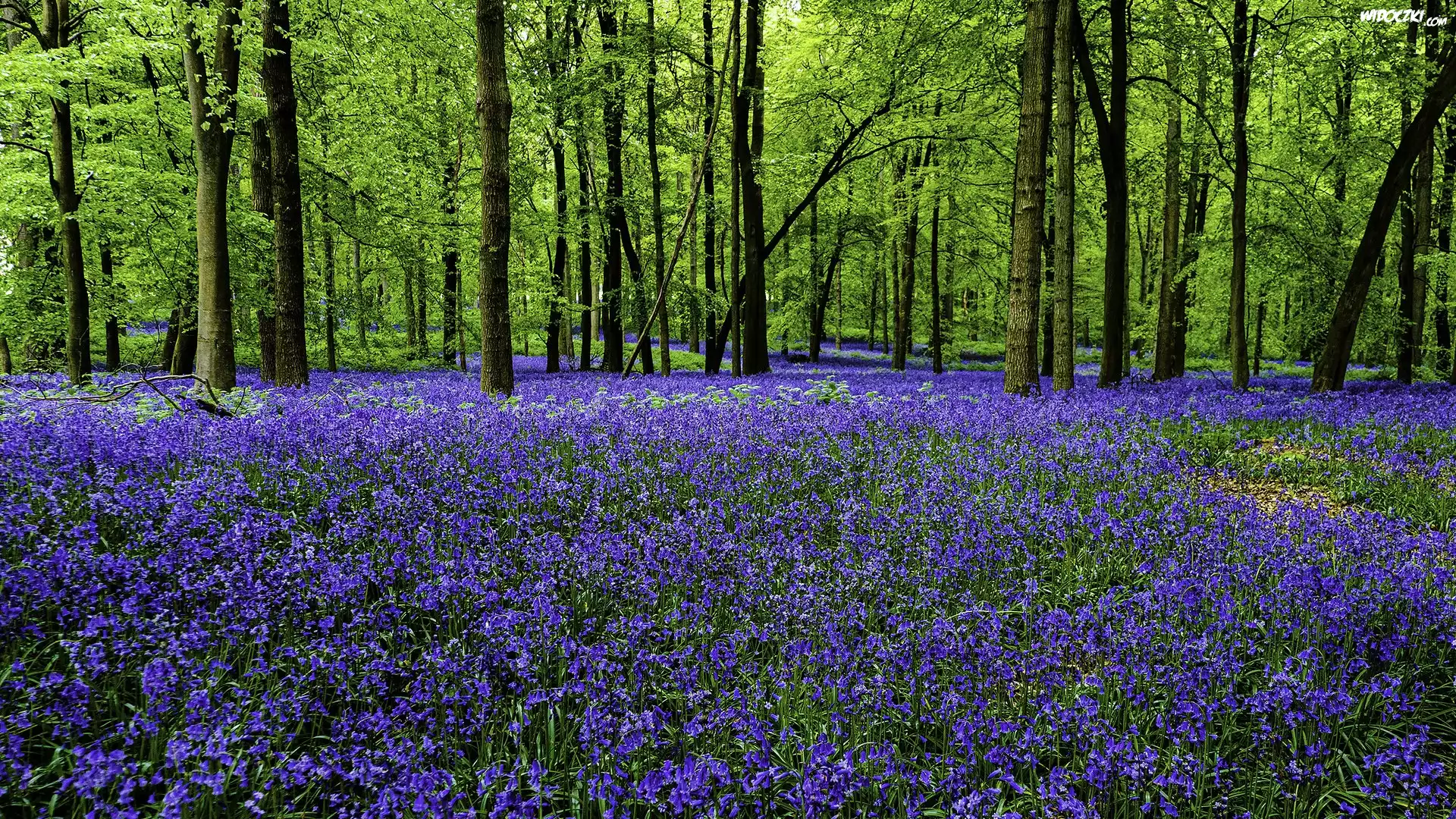 Wiosna, Las, Drzewa, Niebieskie, Kwiaty, Hiacyntowce