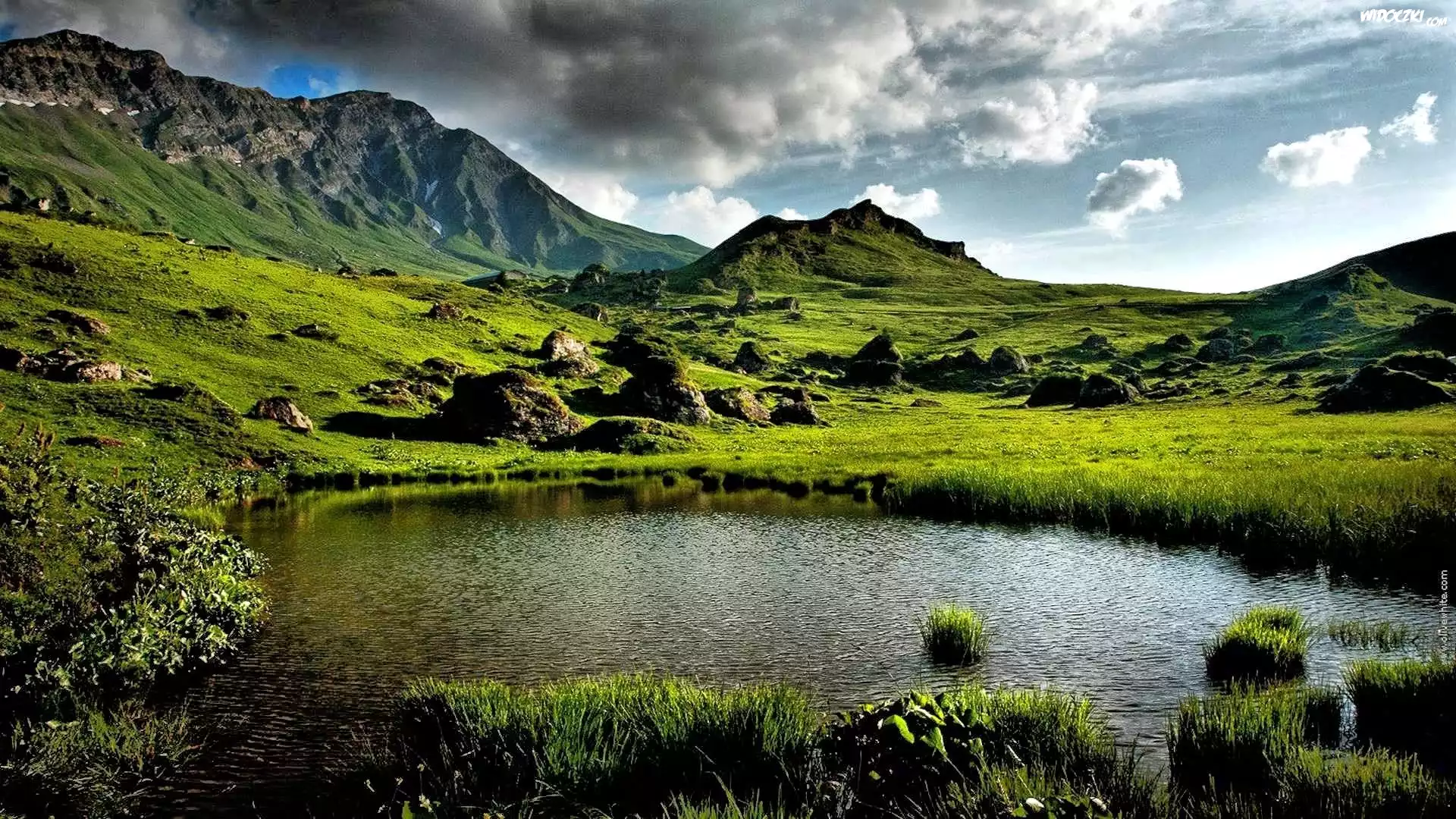 Zdjęcia, Niebo, Chmury, Woda, Łąki, Góry