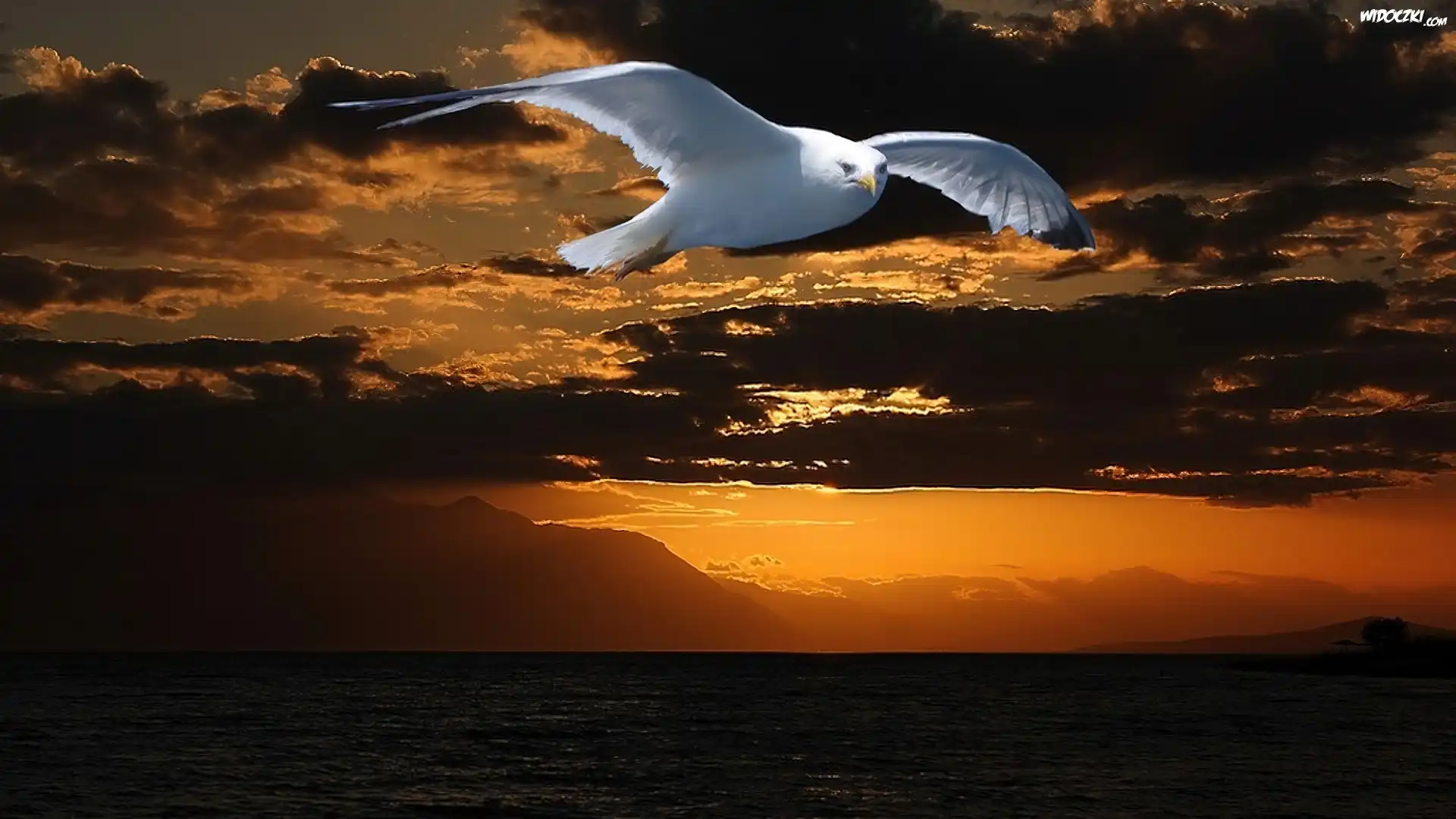 Zdjęcia, Niebo, Zachód, Słońca, Biały, Ptak