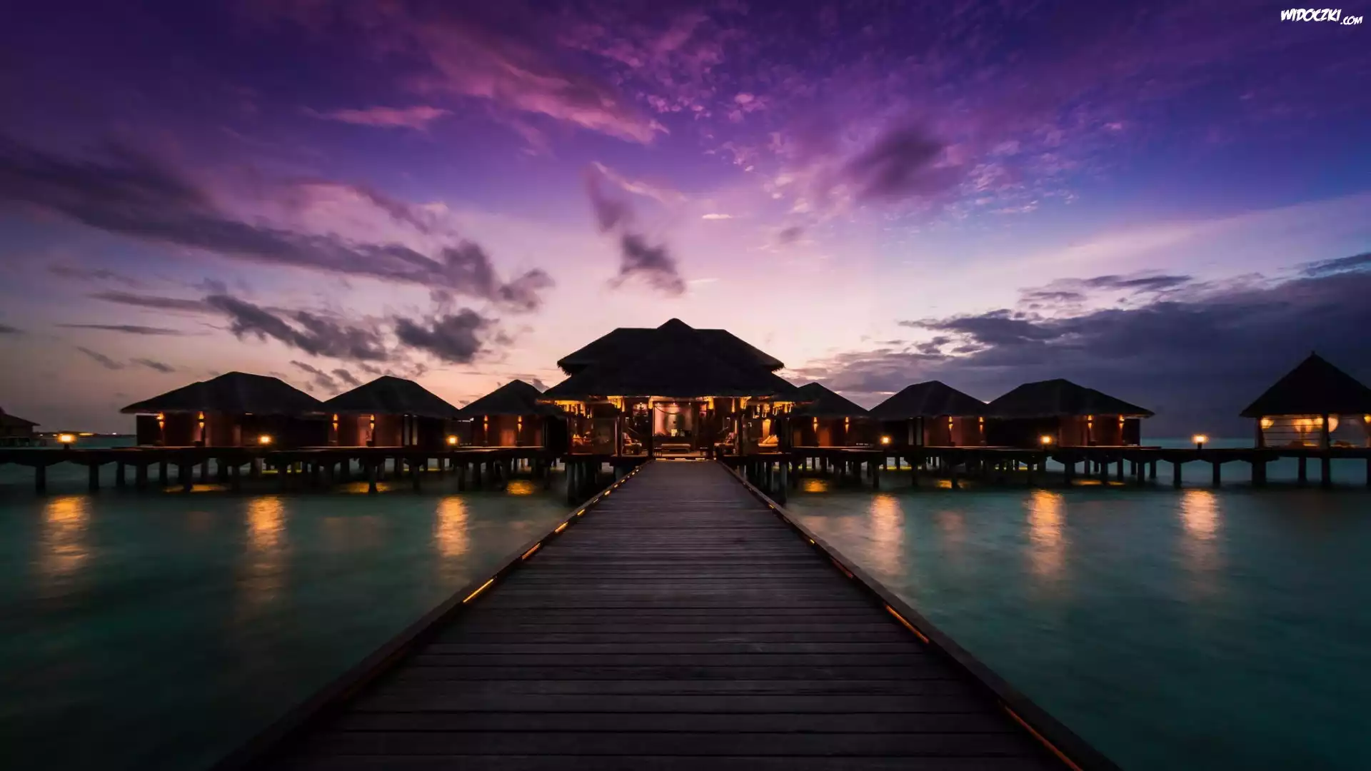 Zdjęcia, Niebo, Zachód Słońca, Pomost, Domki, Morze