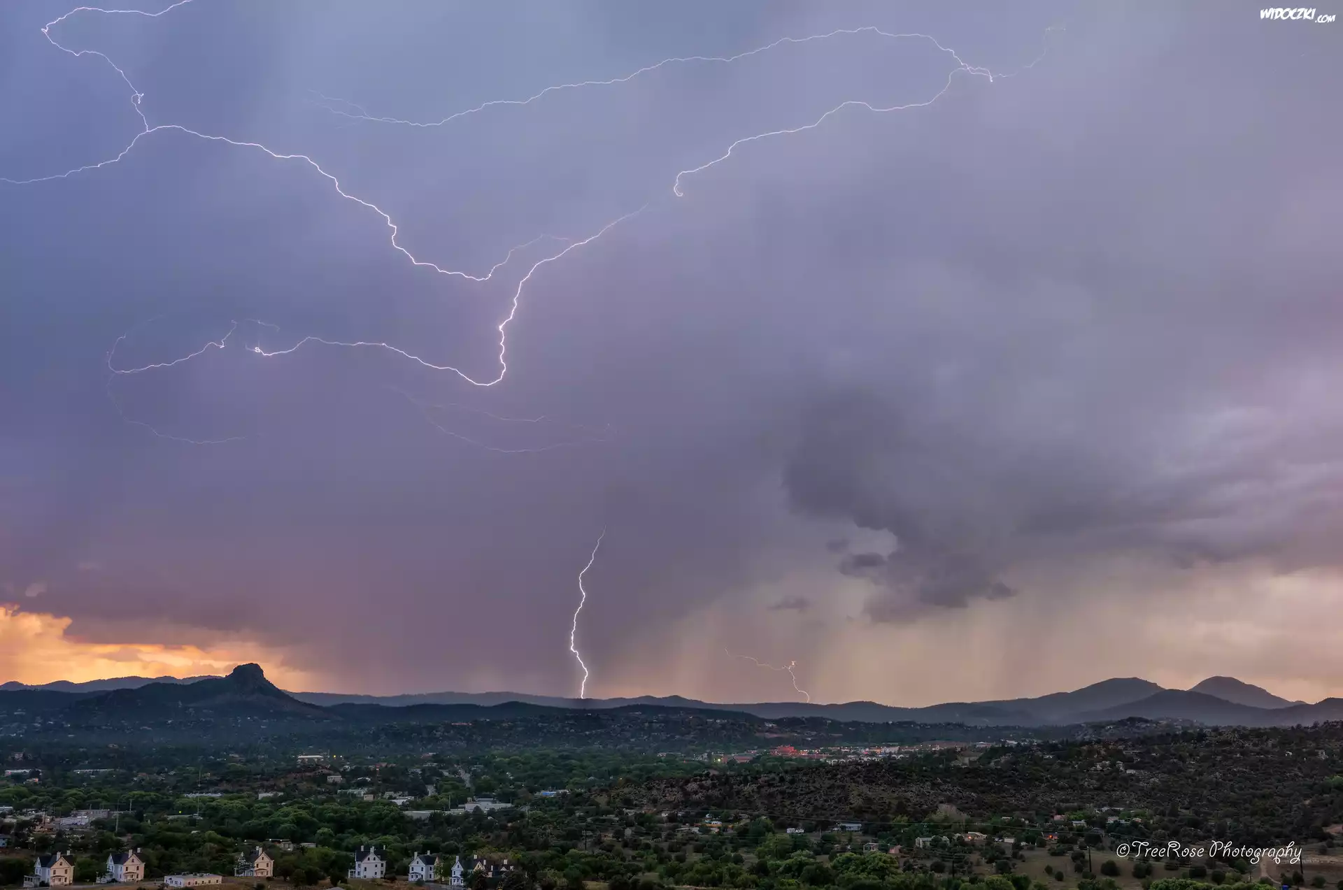 Zdjęcia, Niebo, Chmura, Pioruny, Góry, Domy, Drzewa