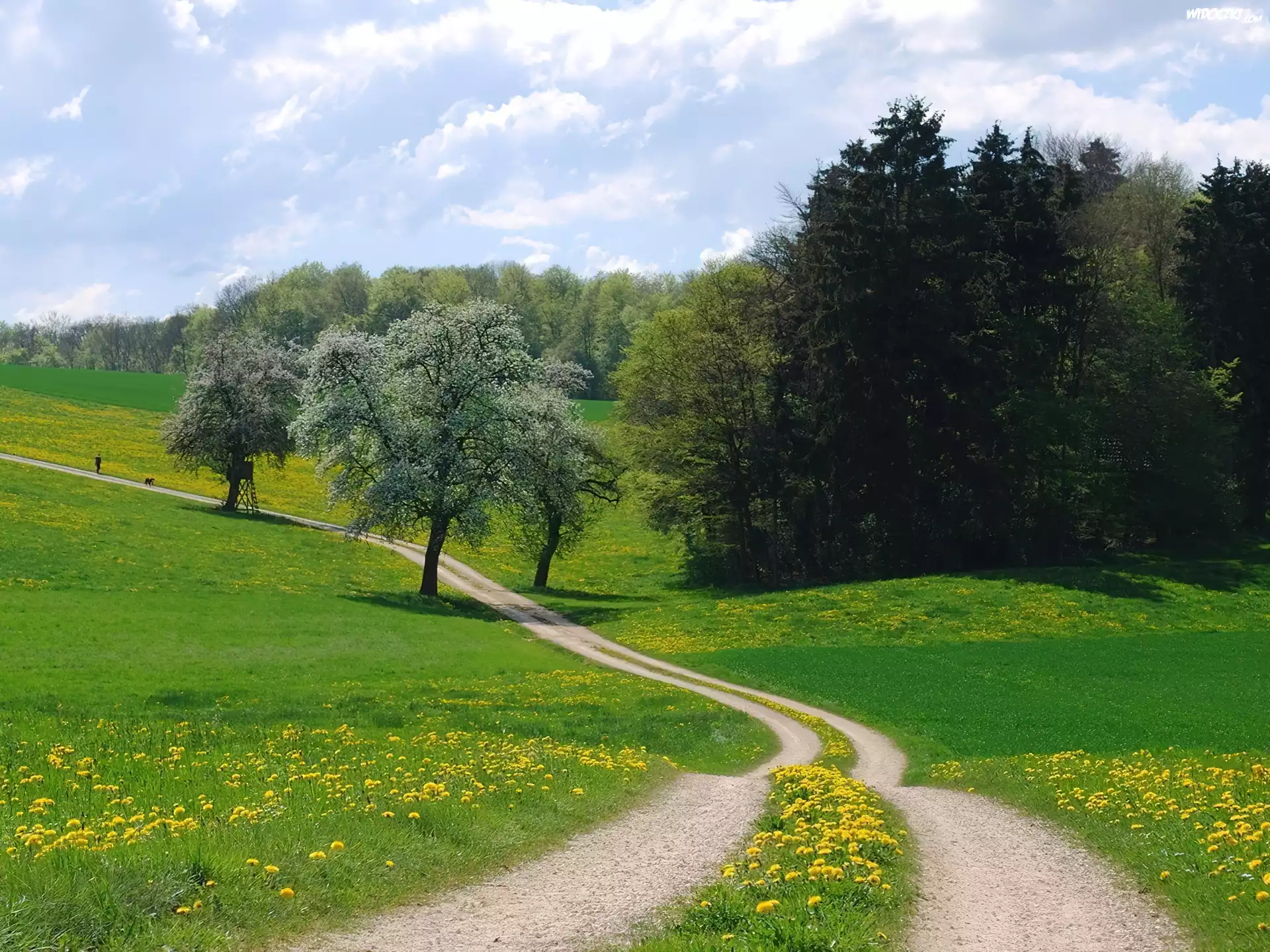 Łąka, Droga, Drzewa, Niebo, Chmury