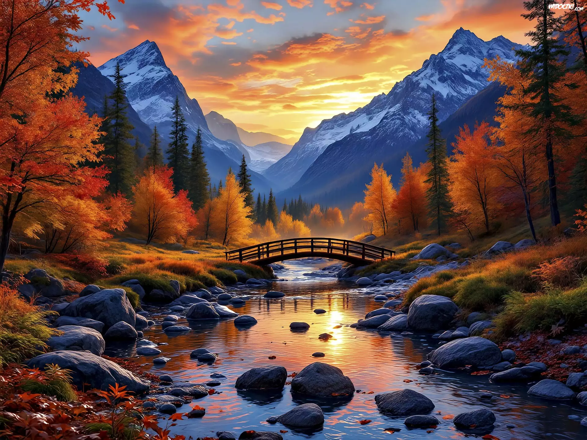 Jeień, Kolorowe, Drzewa, Kamienie, Mostek, Strumień, Góry, Niebo