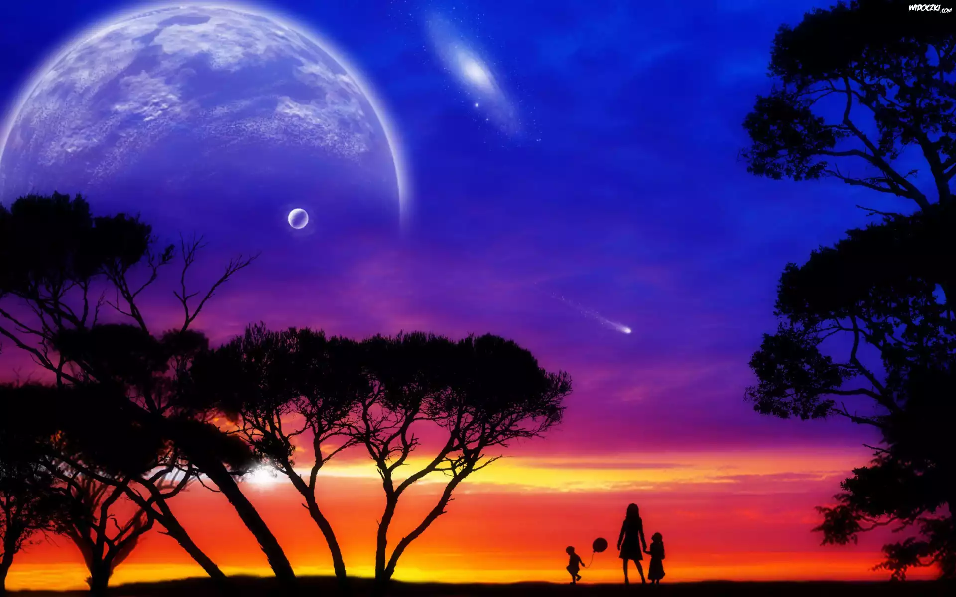 Niebo, Zachód, Księżyc, Planety, Drzewa, Osoby