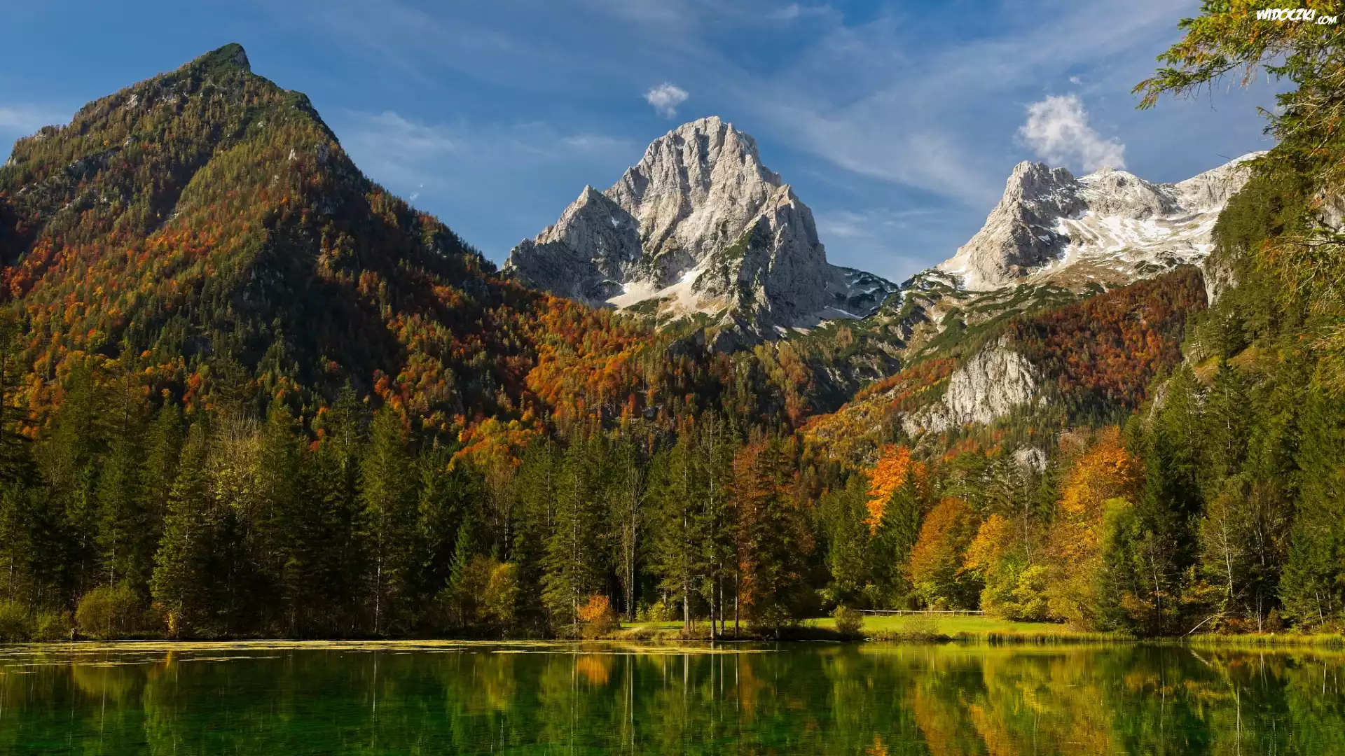 Zdjęcia, Jesień, Las, Drzewa, Jezioro, Góry, Skały, Szczyty, Niebo