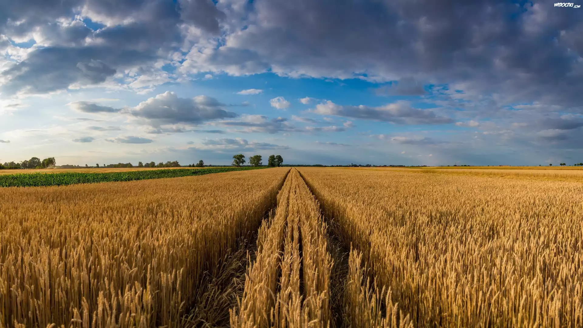 Pole, Zboże, Ścieżka, Niebo, Chmury, Drzewa