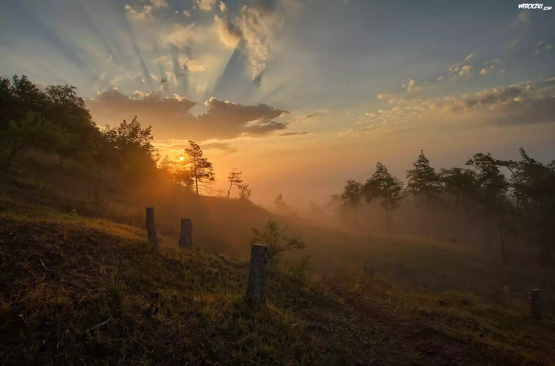 Niebo, Chmury, Zachód, Słońca, Drzewa, Mgła