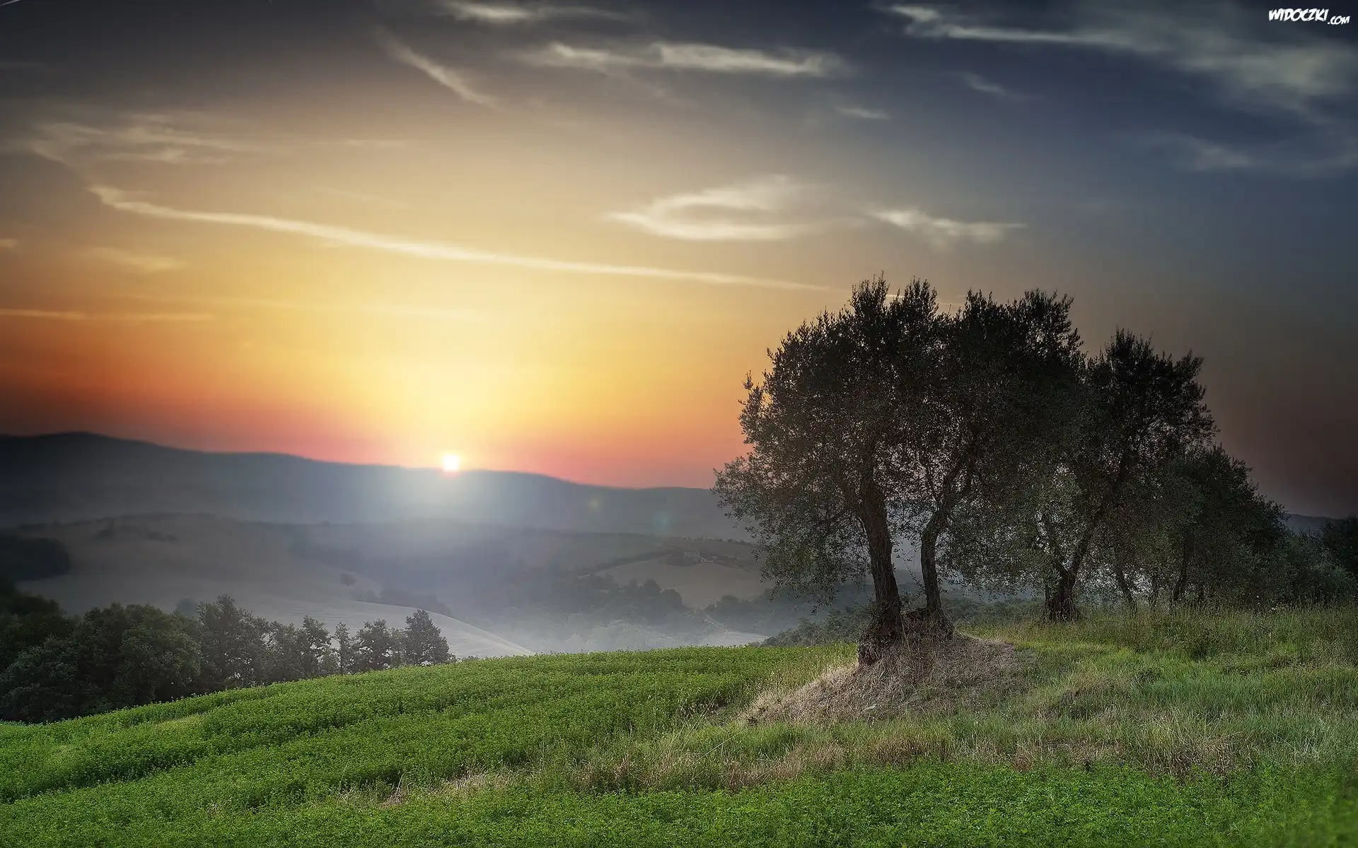 Niebo, Chmury, Zachod, Slonca, Drzewo, Laka