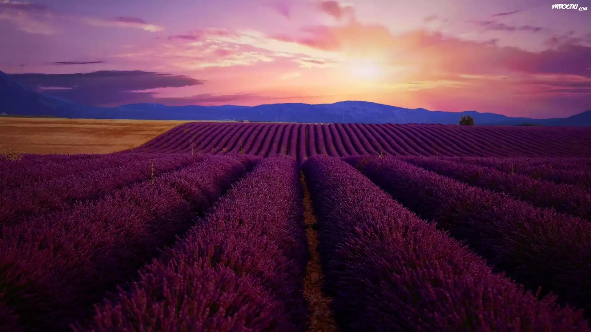Zdjęcia, Zachód słońca, Fioletowe, Niebo, Pole, Lawenda, Góry