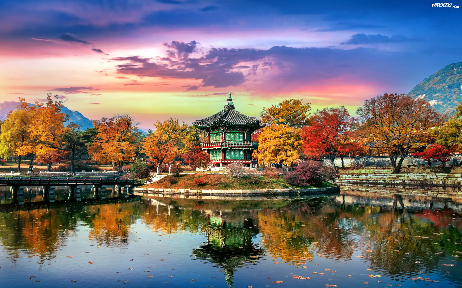 Zdjęcia, Jesień, Drzewa, Góry, Pagoda, Staw, Most, Chmury, Niebo