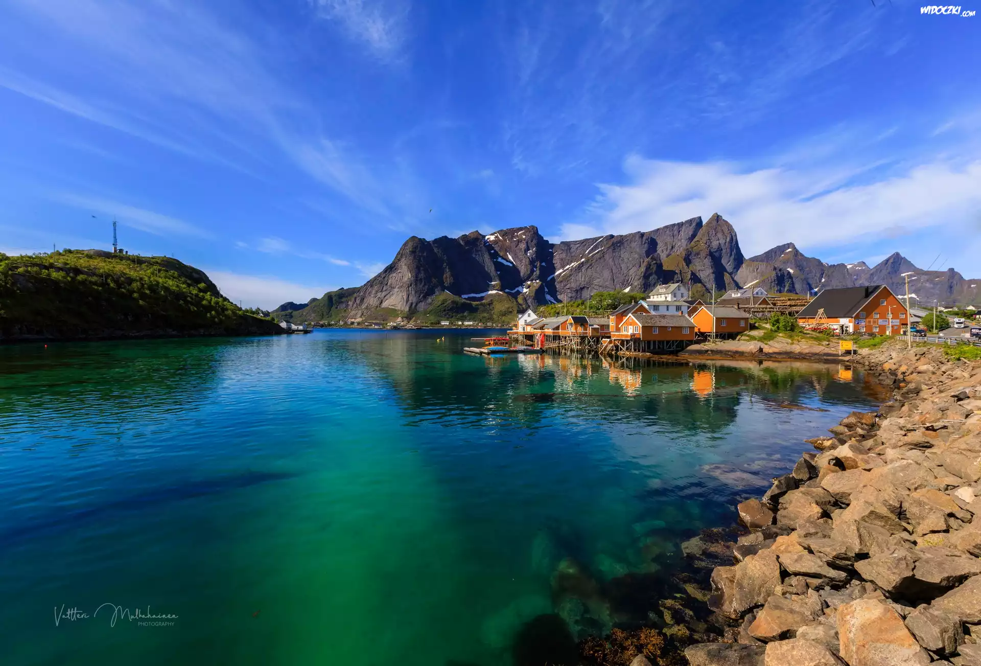 Zdjęcia, Norwegia, Lofoty, Góry, Domy, Morze Norweskie, Kamienie, Niebo
